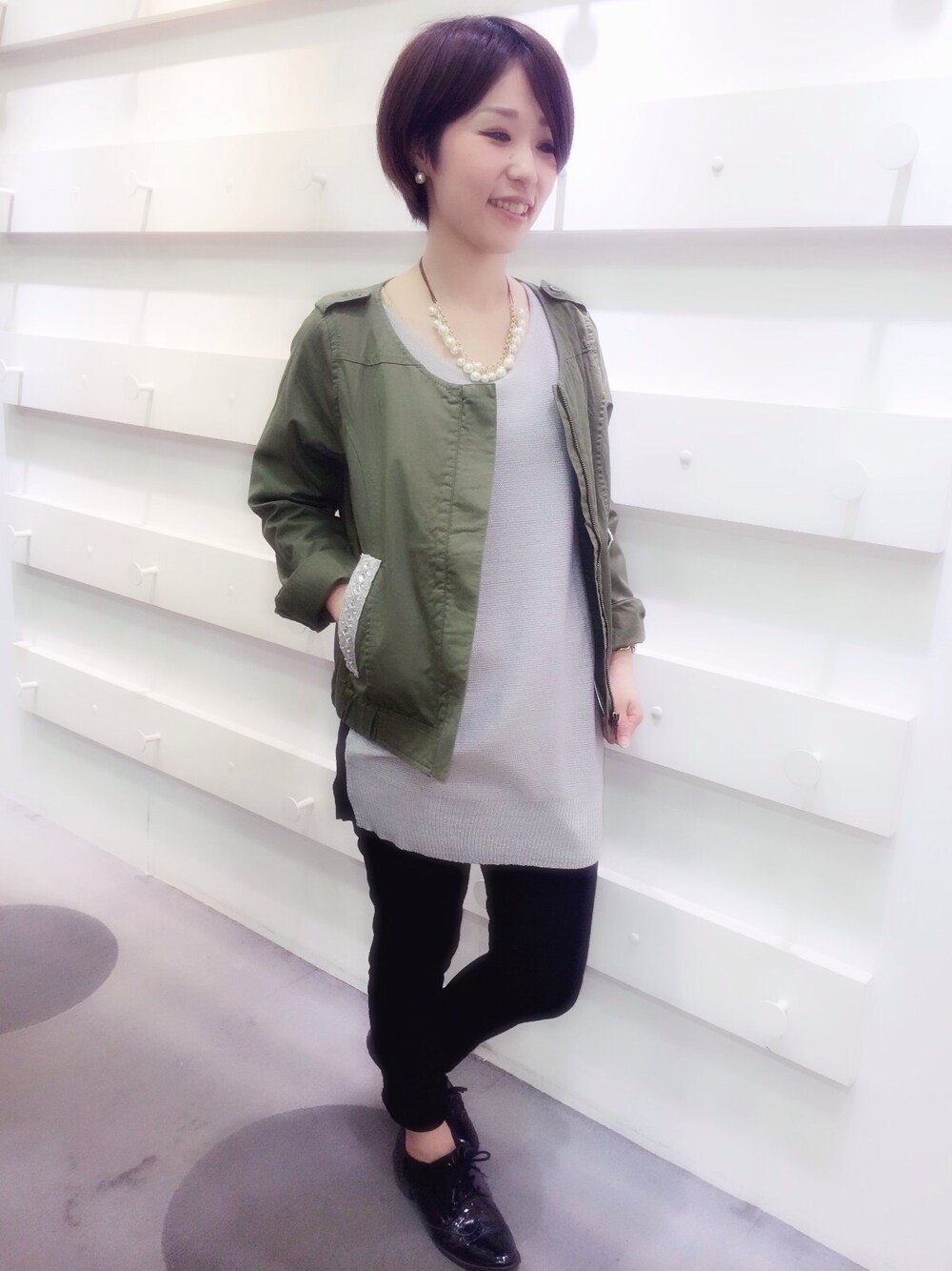 rinaのジャケット/アウター「・ビジュー付ノーカラーミリタリーブルゾン」を使ったコーディネート
