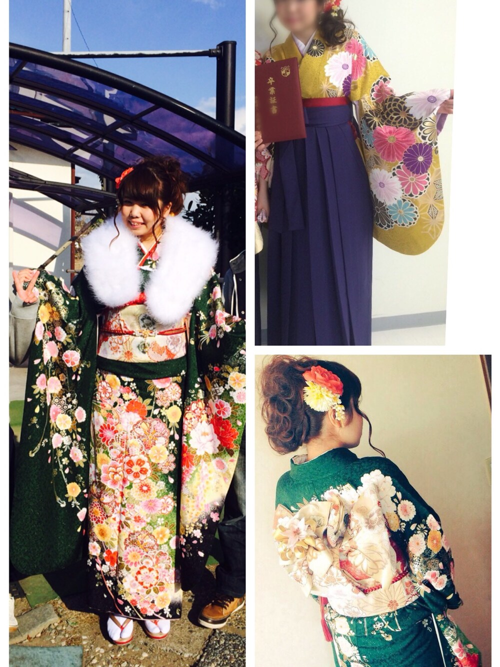 緑が振袖 黄色が卒業式袴 大好きな緑と黄色、成人式と卒業式で着ました。 なかなか周りと被らない色だったしすごい綺麗な柄だし大満足(“Ü“)