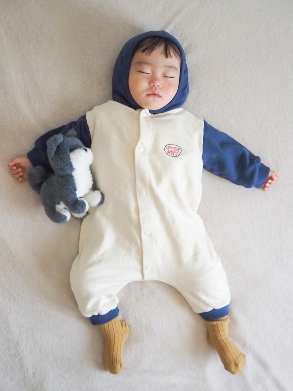 フード付きオーバーオールは1枚で決まる🤍 前ボタンのお洋服はねんね期のベビーにも着せやすくて嬉しい👶🏻