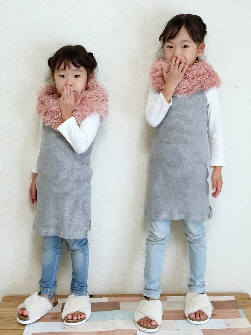 プティマインコーデ💓 たまにはポーズお願いしてみたら 長女👃の中に指入れてふざけてる😂🐽 次女は真顔〜😂😂
