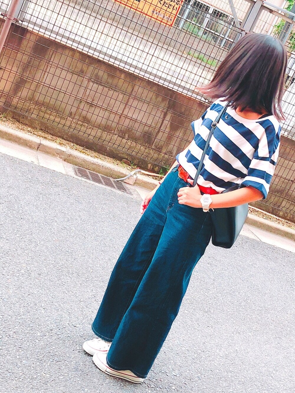 ボーダー×デニムでカジュアルコーデ* UNIQLOのワイドパンツは、 万能です😎! 見てくださる方、 ありがとうございます☺️