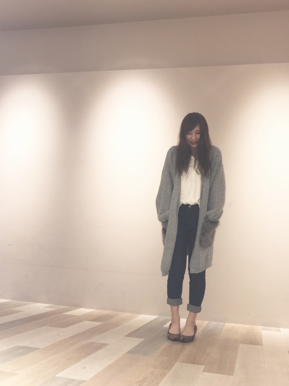 earthの新作のポケットファー カーディガンですっ✨ シンプルなコーデでも ファーポケットで一気に 今年らしさがでます😆💕