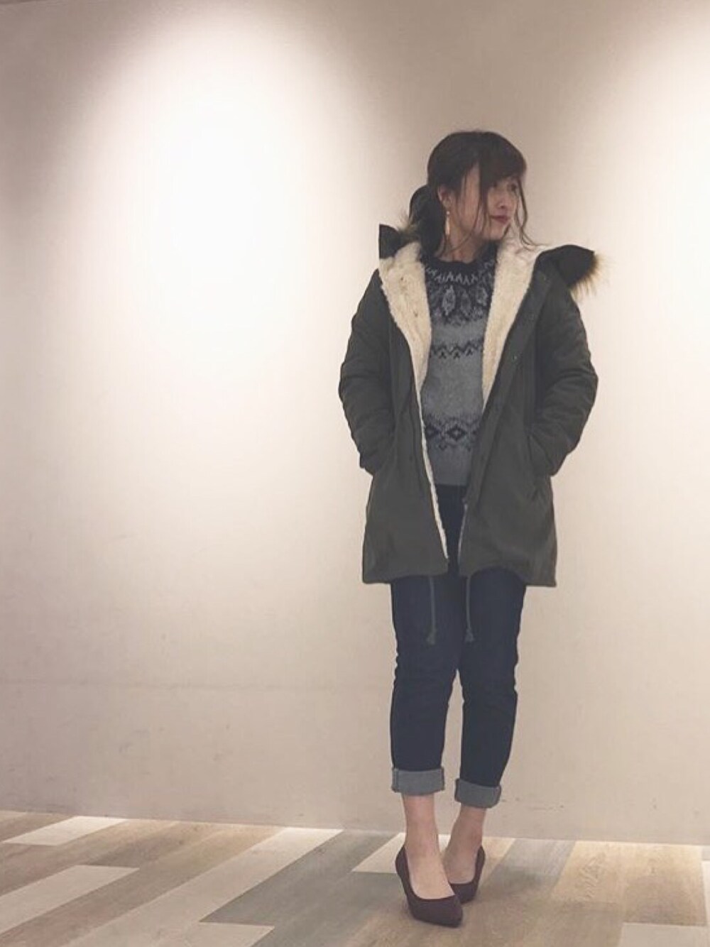 モッズコートっ✨ ふわふわとしたフェイクファーをあしらった、モッズコート。 ヘム部分にはドロストを配しているので、シルエットのアレンジも楽しめます。 トップス 求心風ニットプルオーバー 求心編みで仕上げた表情豊かなノルディック柄がポイントになったニットプルオーバー。ふわふわしたシャギー糸を細分に取り入れて、女性らしく仕上げています。ゆったりしたサイズ感なのでインナーにシャツを足してり、アレンジできます🙆✨