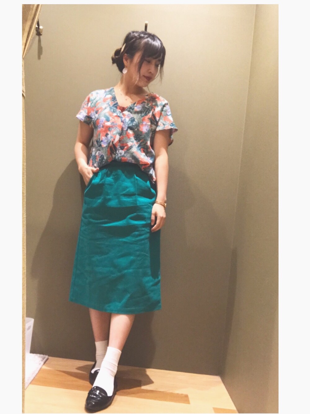 夏コーデ グリーンに統一させたコーディネート😊💕 爽やかなボタニカル柄のブラウスは 前後Vネックのラインが首元をスッキリ見せてくれ、後ろのレースアップのデザインがアクセントになってくれます💕 今年は街でもグリーンのアイテムを使用したコーディネートを良くお見かけします💕1枚あると使えること間違いなし😌