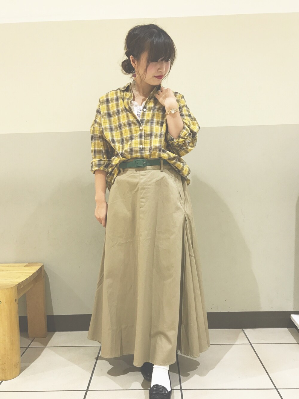 バイトちゃんがコーディネート考えてくれました🤓🍓 #fuka'scoordinate 今回のテーマは「腰回りカバー」 シルエットは、ややゆとりのあるドロップショルダーのスキッパーシャツを前部分だけインする事で腰回りカバーを叶えてくれました💕 ベージュのロングスカートに緑のベルト合わせでアクセントとなり、まとまりもgood💕 イロイロコットンスキッパーシャツは、 無地5色、ストライプ2色、チェック柄5色とバリエーション豊富なのできっとお気に入りの1枚が見つかるはずです💕 お値段もお手頃です!税込2149円✨ #秋コーデ #秋#秋服#秋服コーデ #ファッション #秋服好き#グリーンパークス#greenparks
