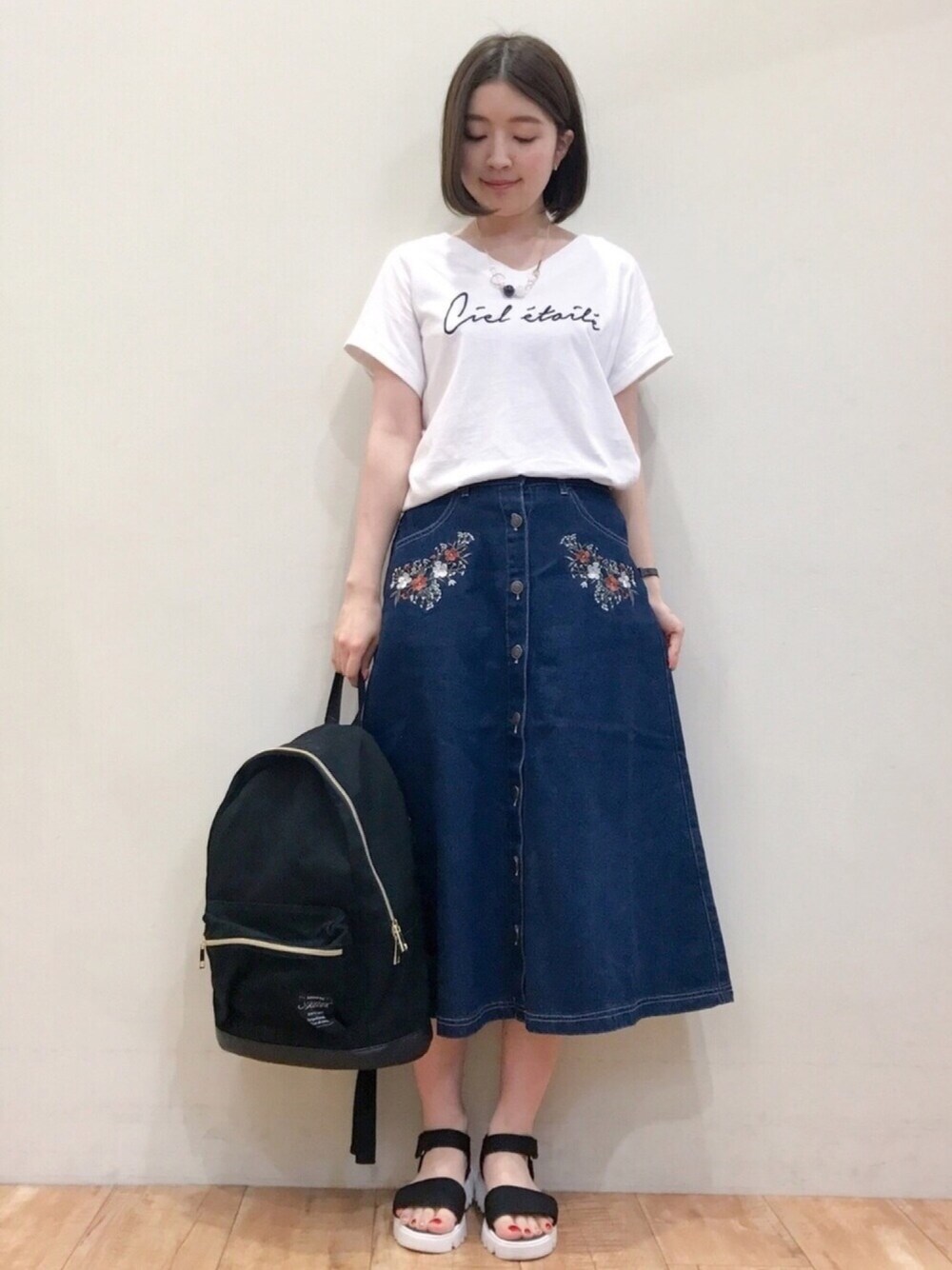 ご覧いただきありがとうございます(*^o^*) いつも いいねやお気に入り+、フォローもありがとうございます♡ 今日はお休みー♡ 帰省中の友達とランチ予定で、めっちゃ楽しみです(*^^*)🍴💕 そんな本日は、カジュアルDAY👕 ロゴTにデニムスカートを合わせた、シンプルカジュアルコーデです^^ デニムスカートは花柄の刺繍が入ってて、少しレトロな感じが可愛いです♡ 前開きのボタンもアクセントになるので気に入ってます😍 ウエスト後ろにゴムが入っているので、めっちゃ楽♪ いっぱい食べても安心です 笑 小物は安定のカジュアル合わせで☺️✨ リュックにスポサン♡ 見てくださってありがとうございます♡ インスタもマイペースですが、更新中(^ ^) ぜひこちらも遊びに来て下さい♡ Instagram▷rina_y26