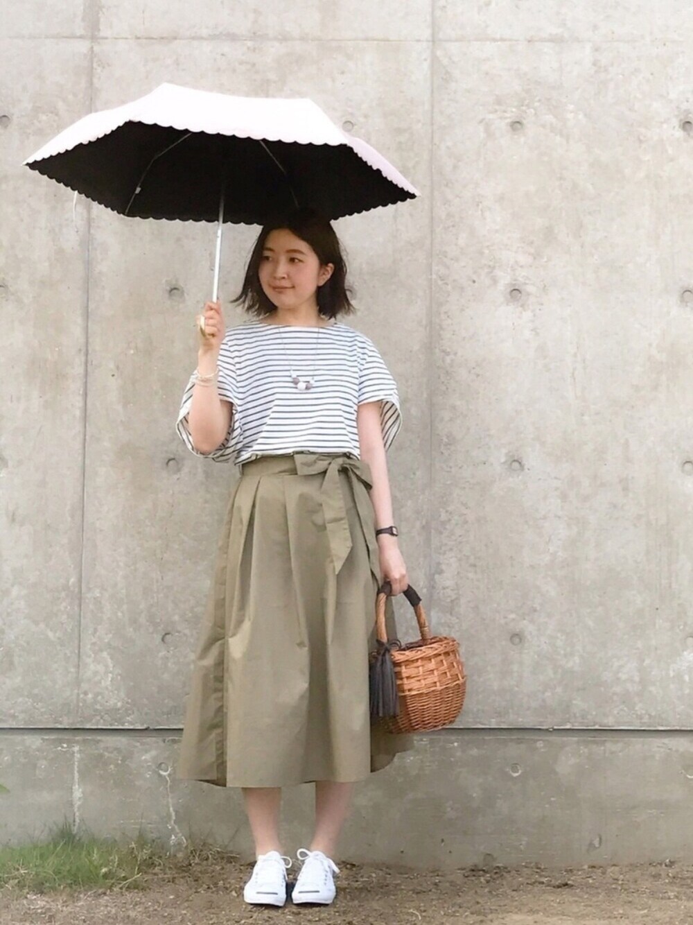 ご覧いただきありがとうございます(*^o^*) いつも いいねやお気に入り+、フォローもありがとうございます♡ 昨日はお休みだったので、映画観に行ってきました(*^^*) 今度こそ美女と野獣!!笑 やっと観れました♡😍 エマちゃんが可愛すぎでした💕 また観たい☺️✨ そんな昨日の休日コーデ♪ 今日のでないんかいと思いつつ、UP 笑 梅雨なのにあまり雨が降らないので、日傘コーデです☂️ シューラルーの晴雨兼用の折り畳み傘は、なんと紫外線遮蔽率・遮光率99%以上と優れもの◎ 防水タイプなので、もちろん雨の日も使えます☔️ 私が購入したのは、薄いピンクに白ドット柄の柔らかい雰囲気のものです♡ ネイビーの日傘は持っているので、新調するなら明るい色かな〜と選びました^^ バッグに入れてると、可愛いピンクが見えてテンション上がります😍 コーデは、ボリューム袖のボーダーTシャツにカーキ色スカート合わせでカジュアルに👟 見てくださってありがとうございます♡ インスタもマイペースですが、更新中(^ ^) ぜひこちらも遊びに来て下さい♡ Instagram▷rina_y26