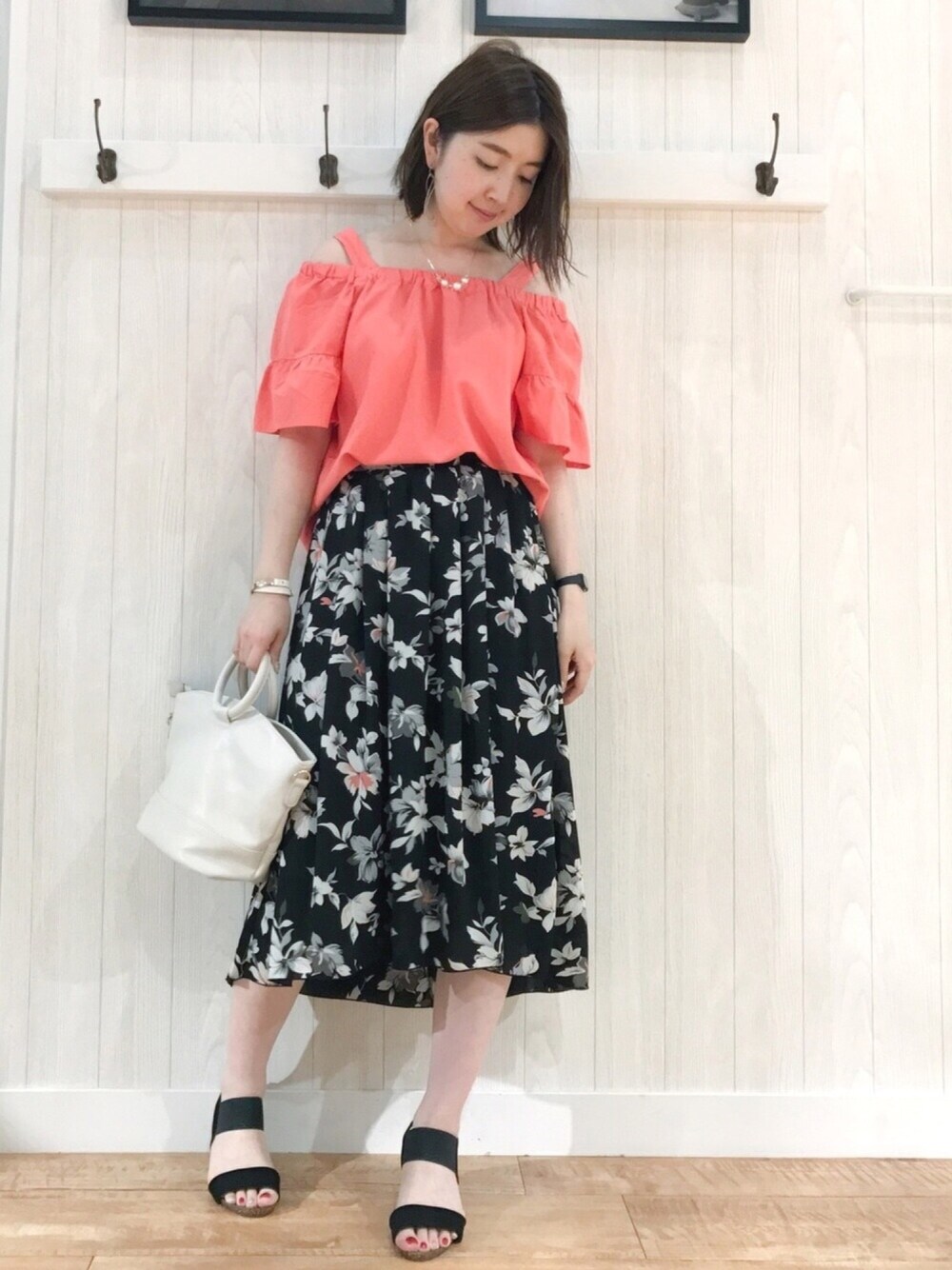 ご覧いただきありがとうございます(*^o^*) いつも いいねやお気に入り+、フォローもありがとうございます♡ 本日は、ピンク×ブラック✨ ハッキリ濃いめのオレンジっぽいピンクに一目惚れ♡😍 明るい色を着ると、夏な感じで元気が出ます☺️ こちらのDRESKIPのオフショルブラウスは、肩の紐をボタンで取り外し可能です◎ 紐なしで、ヘルシーに肩出し♪ もしくはあまり肩を出さなくても大丈夫です^^ 別ショットは肩出し弱めに着てます♡ 花柄スカートは、以前イエローをはいていた分の色違い^^ 黒地に白のお花が可愛いです💕😍 全体で黒の分量が多いので、バッグとネックレスは白で明るさを出しました♡😆 見てくださってありがとうございます♡ インスタもマイペースですが、更新中(^ ^) ぜひこちらも遊びに来て下さい♡ Instagram▷rina_y26