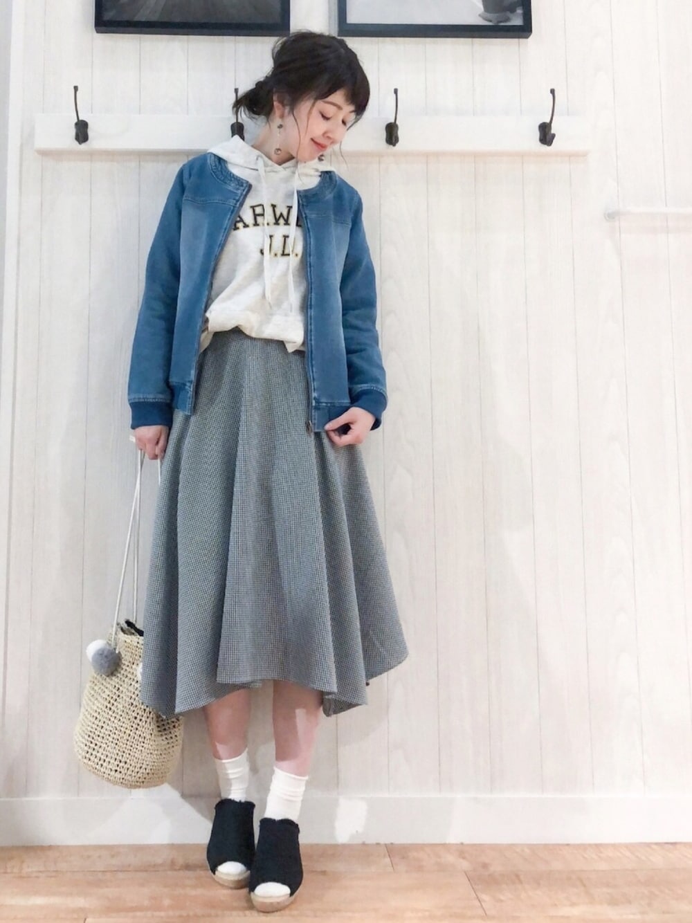 ご覧いただきありがとうございます(*^o^*) いつも いいねやお気に入り+、フォローもありがとうございます♡ 少し暖かくなりましたね〜🌸☺️ 今日お休みなので、ちょっとお買い物に出かけようと思ってます(*^^*) 春コーデで出かけられそうなのが嬉しいです♡ そんな本日は、ロゴパーカー×ギンガムチェック柄スカート✨ アウターには、Cutie Blondeのノーカラーのデニムブルゾンを合わせました(^o^) こちらのデニムブルゾン、裏側がスウェットのように柔らかいタイプで着心地抜群です💕 ロゴパーカーを合わせてカジュアルに♪ 前が少し短いシルエットでゆるっと着やすいです(*^^*) プチプラ♪2149円✨ 色違いで揃えたいなと思う可愛さです♡ アイボリー・グレー・グリーン・ネイビーの4色展開✨ スカートはDRESKIPのイレギュラーヘムスカート☺️ 裾がひらひらっと変化のあるデザインで、歩いた時の揺れる感じがとっても可愛いです❤️ 同じ素材のリボン付きですが、今回はカジュアルにしたかったので外してます😄 ブラウスをインして、きれいめに着るのもオススメです🤗 この春気になるギンガムチェック💕 つい選んじゃいます♪ バッグも春夏っぽく巾着型のペーパーバッグ💕 ポンポンチャームも可愛くて一目惚れでしたー😍 見てくださってありがとうございます♡