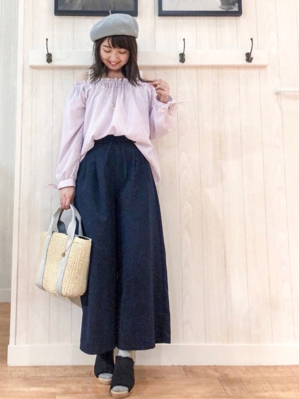 ご覧いただきありがとうございます(*^o^*) いつも いいねやお気に入り+、フォローもありがとうございます♡ 本日は、ラベンダー×ネイビー♪ DRESKIPのオフショルにもなるストライプブラウスに、お気に入りの麻調のワイドパンツを合わせました✨☺️ ブラウスは、襟元にラメラインの入ったタンクトップもセットになってます♪ 襟元がゴムギャザーになってるので、オフショルにもしやすかったです(*^^*) あと、ストライプのカラーが可愛くて💕 トレンドのラベンダー色♡ ネイビー・ブルー・ラベンダーの3色展開です😊 オフショルではない普通バージョンも、小窓に載せてるのでぜひご覧下さい♪ ワイドパンツも、さらりとはきやすくて気に入ってます❤️☺️ シルバーラメのテープが可愛いかごバッグは、一目惚れでしたー😍 チャームも付いていてアクセントになっているのもポイントです🙋♀️💕 見てくださってありがとうございます♡