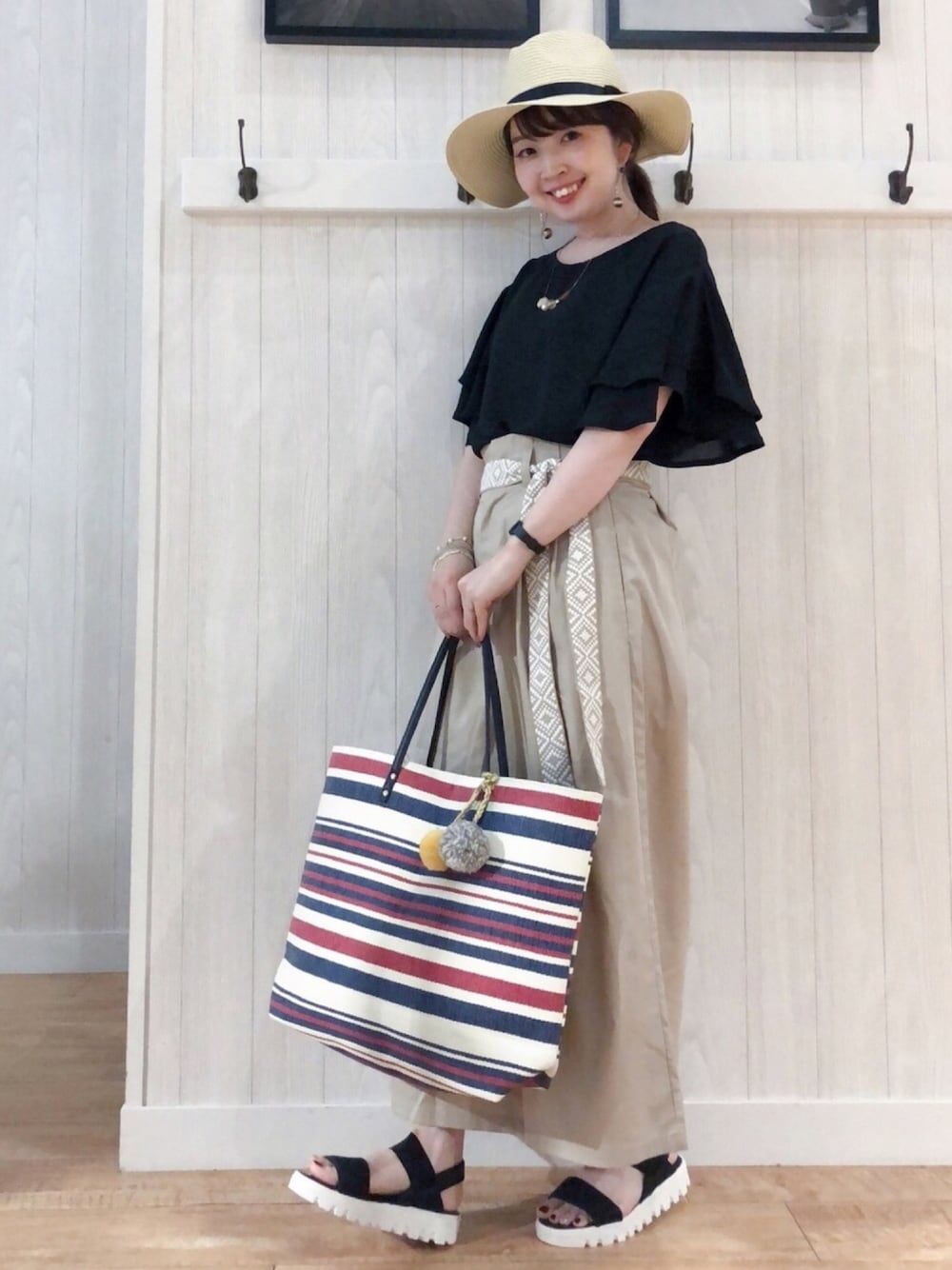 ご覧いただきありがとうございます(*^o^*) いつも いいねやお気に入り+、フォローもありがとうございます♡ 本日は、ブラック×ベージュ♪ DRESKIPのお袖のデザインが可愛いプルオーバーに、トライバル柄のベルト付きのワイドパンツを合わせました☺️✨ こちらのプルオーバー、お袖の広がりが大きめで可愛くて♡ ひじ少し上までの長さなので、二の腕カバーもできていい感じです👍✨ プチプラ♪2149円です😘 ワイドパンツは少し光沢のあるチノっぽい素材で、ベルトなしだときれいめにも使えます♪ ハイウエストなので、インした時にスッキリ見えます(^^) 大きめのボーダー柄のトートバッグとハットで、ちょっとリゾート🏝なイメージです😆 足元はスポサンで楽ちん♪ 足首部分ゴムなので、片手でさっと履けて便利です(^^) 見てくださってありがとうございます♡