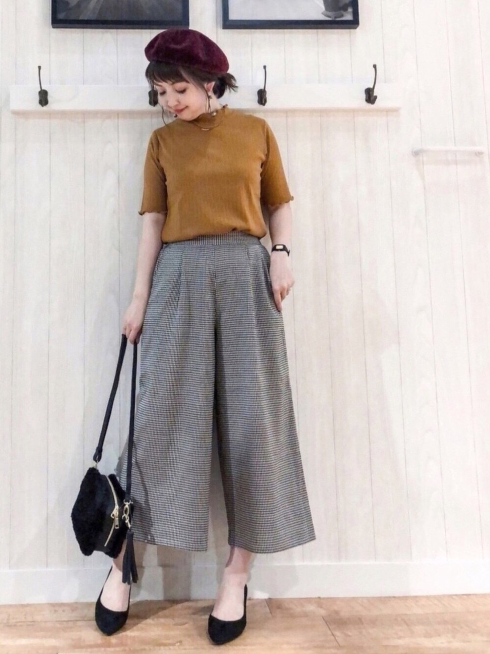 ご覧いただきありがとうございます(*^o^*) いつも いいねやお気に入り+、フォローもありがとうございます♡ タイムライン回る前に失礼します🙇♀️ また見に行きますね! もうすぐ台風がやってきますね😢 あんまりひどくなりませんように🙏 私の住んでるところは、今は晴れてるけどもう暴風警報が出たみたいで💦 まだそんなに風吹いてなさそうですけど😅 今日はお休みなので、引きこもって過ごしたいと思います 笑 本日は、明るめキャメル×チェック♡ 少しハイネックのリブトップスに、千鳥格子のチェックかな?小さめチェックのワイドパンツを合わせました✨ 秋気分のカラーと柄で先取りコーデです🙋♀️ トップス、襟元とお袖と裾がメロー仕立てで可愛くて💕😍 このちょこっとヒラヒラ感が好みです❤️ あと、この形が好きなのでもう一色欲しいなって狙ってます 笑 ブラック・ダークグリーン・ボーダー・キャメルの4色展開です☺️ ワイドパンツもブラウン系で秋らしく🍁 今年はチェック柄が豊富でつい選んじゃいます☺️ こちらのワイドパンツは、シャリっとした生地でさらさらと涼しく穿けます♡ ウエストも後ろゴムなので、脱ぎ穿きも楽ちん✨✨ あと、小物は赤のモールベレー帽にエコファーバッグ合わせ☺️ ちょっと早いけど、小物で秋気分です♪ 足元はお気に入り♡スキップできるパンプス👠ドレスキップスで✨ 今回はブラック♪ 冠婚葬祭にもお仕事にも便利なパンプスです✨ 見てくださってありがとうございます♡