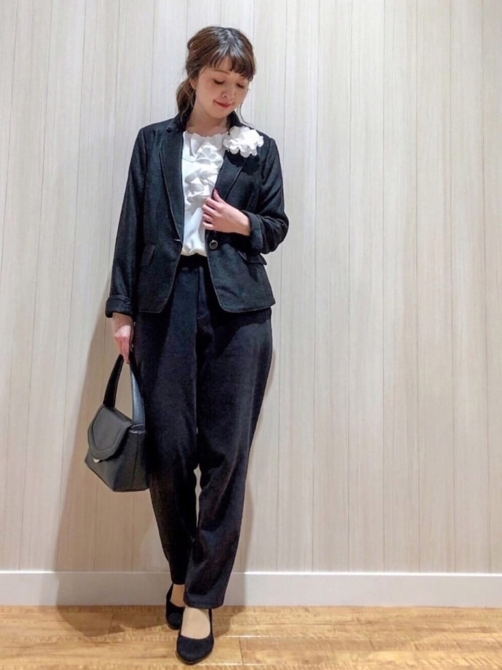 ご覧いただきありがとうございます(*^o^*) いつも いいねやお気に入り+、フォローもありがとうございます♡ ネイル💅変えました〜😊 春っぽくピンクにお花で可愛い感じになりました🙋♀️ ネイル綺麗になるとテンション上がりますね♡ 本日は、セレモニースタイリング🌸 いよいよ間近になってきた、卒園・卒業のお式のイメージでブラックスーツスタイルです😊✨ ストレッチの効いたテーラードジャケットに、フロントフリルのブラウス、テーパードパンツをあわせました🙋♀️ どのアイテムも手洗い可能なので、お家でのケアもできて便利です✨ あと、こちらのジャケット本当にストレッチが効いてて動きやすいです♪ 着てても肩が凝らない✨ 仕事で1日着てても楽なので、ヘビロテしてます🙆♀️ 実は2個前の投稿のジャケットと小物を変えてるだけなのですが、雰囲気変わることないですかー?☺️ シューラルーのスーツは着回しもできちゃうのでオススメです♪ 見てくださってありがとうございます♡