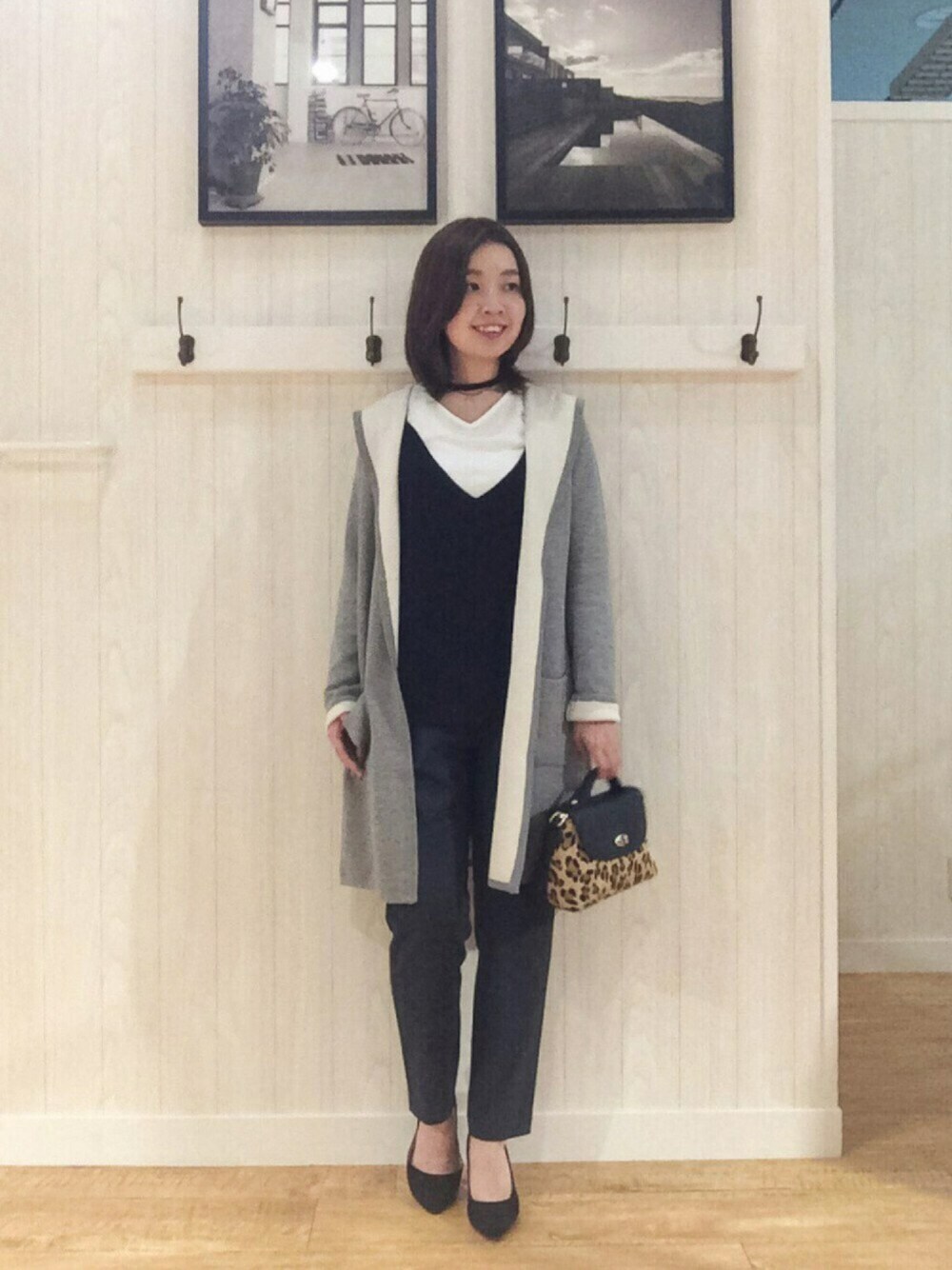 *シンプルきれいめカジュアルコーデ* ニットキャミとTシャツのセットに、Wフェイスのフード付きカーデを合わせたシンプルコーデ♪ 無地のシンプルなコーデなので、ヒョウ柄のバッグでアクセントにしました(^o^)/ ニットキャミはヘリンボーン柄の編み地が立体的で可愛いです(*^_^*) 程よいフィット感があるのでスタイルアップして見せられるのが嬉しいポイント☆ VネックのTシャツもセットなので、着回し力も抜群です◎ カーディガンは、表と裏と色の違うニットを編み合わせたWフェイスがポイント☆ 柔らかい生地なので、さわり心地と着心地がとてもいいです! 薄すぎず厚すぎずで、今すぐから長く着られるので活躍期間長そう♪ パンツはとろみがある素材感で落ち感があって履きやすいです♪ シルエットは太ももあたりがゆるめで、 足首に向かって細めになっていくので、足のラインが綺麗に見えてお気に入りです◎