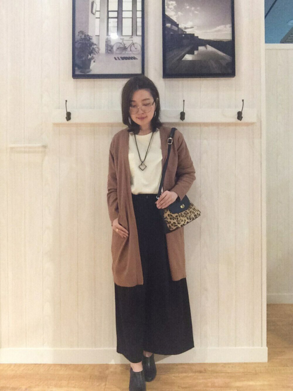 *ヒョウ柄がポイント♪シンプルコーデ* 3連休が終わりましたね(^o^)/ 私は3日間とも仕事だったので、いつも通りの日常でした(笑) そしてこの3連休!急に寒くなりましたね〜💦 この間まで暑い暑いって思ってたのに、ビックリです(^^;; 気温差で、風邪ひかないように気をつけなきゃですね>_< そんな急に寒くなった本日のコーデは、ヒョウ柄とキャメルのカーデがポイントのシンプルコーデ♪ シューラルーのロングカーディガンに、DRESKIPのポンチ素材のカットソー、ワイドパンツを合わせました(^o^)/ このままだとかなりシンプルなので、ヒョウ柄のバッグで柄を取り入れてアクセントにしました♪ いつもの、小物でアクセント作戦です(笑) こちらのシューラルーのカーディガン、1番の素敵ポイントは肌触り! やわらかモチモチのニットで着心地抜群なのです♡ 半袖や五分袖のインナーと重ね着をする今、少しでもチクチクするニットカーデは着られないですからねぇ💦 その点こちらは全く問題なく、気持ちよ〜く着ることができています♪ シルエットはすとんとスッキリしていて、ワイドパンツやスカンツなどのボリュームあるボトムとも相性抜群です♡ 合わせたインナーは以前のコーデの着回しです。五分袖なので重ね着して、気温対応しやすいのが◎です(^o^)/ パンツは落ち感のあるゆるっとしたワイドパンツ♪ 程よいゆる感で履き心地抜群です(*^_^*) 楽なのに広がりすぎずのシルエットで、 キャメル×クリーム色のトップスを黒のパンツで引き締めました。 合わせた靴は、6センチヒールの高すぎ ず低すぎずな歩きやすいブーティー♪ シンプルな分コーデを選ばず、合わせやすいです♡ 長文失礼いたしましたm(_ _)m ご覧いただきありがとうございます(*^_^*)