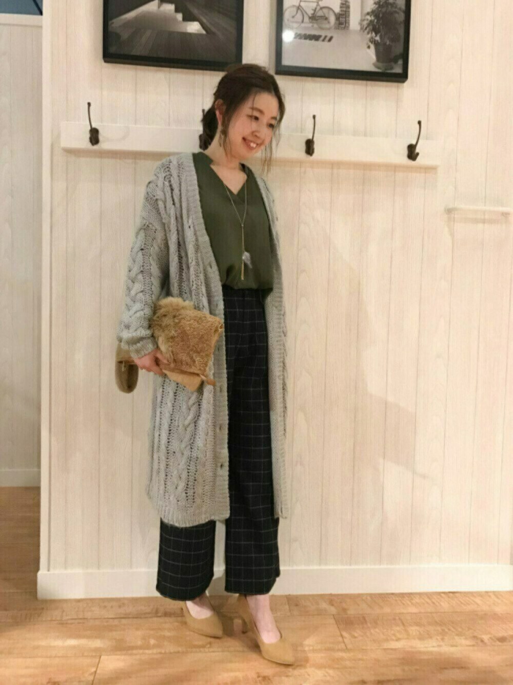 ご覧いただきありがとうございます(*^_^*) 本日は、ライトグレーのケーブル編みのロングカーディガンがポイントのゆるコーデ♪ こちらのロングカーディガン、ちょっと大きめで丈も長めで、ゆるゆる感が可愛くてお気に入りです♡ ざっくりしたケーブル編みが、ナチュラルな雰囲気です(^^) なのに商品検索しても出てこないー!( ; ; ) ちなみにシューラルーの新作です♪ きっと近日、オンラインストアにもUPされるはず(笑) カーキ色のVネックスキッパーシャツに、黒のチェック柄のワイドパンツを合わせて大人っぽさも出してます◎ ロングカーデ×ワイドパンツで、ゆるゆるコーデなのですが、シャツをインしてスッキリ脚長効果狙ってます(^o^)/ チェック柄のワイドパンツはDRESKIPの新作なのですが、こちらも商品検索しても出てこなかったので、また近日UPされるはず!笑 もしくは、お近くのシューラルーで見ていただきたいです♪ 合わせた小物は、もふもふファーの2wayクラッチ(^^) ついに全3色、写真UP完了です(^o^)/ パンプスとクラッチの色を合わせて統一感を出しました(*^_^*) 昨日は暑かったですね💦 また週末、気温下がるみたいですが(^^;; まだ今年のアウターを準備していないので、そろそろどれを買うか決めなきゃです! 急に寒くなった時に困りますしね(;´д`) 今週たくさん新作の可愛いコートが入ってきたので、またコーデに取り入れます♡