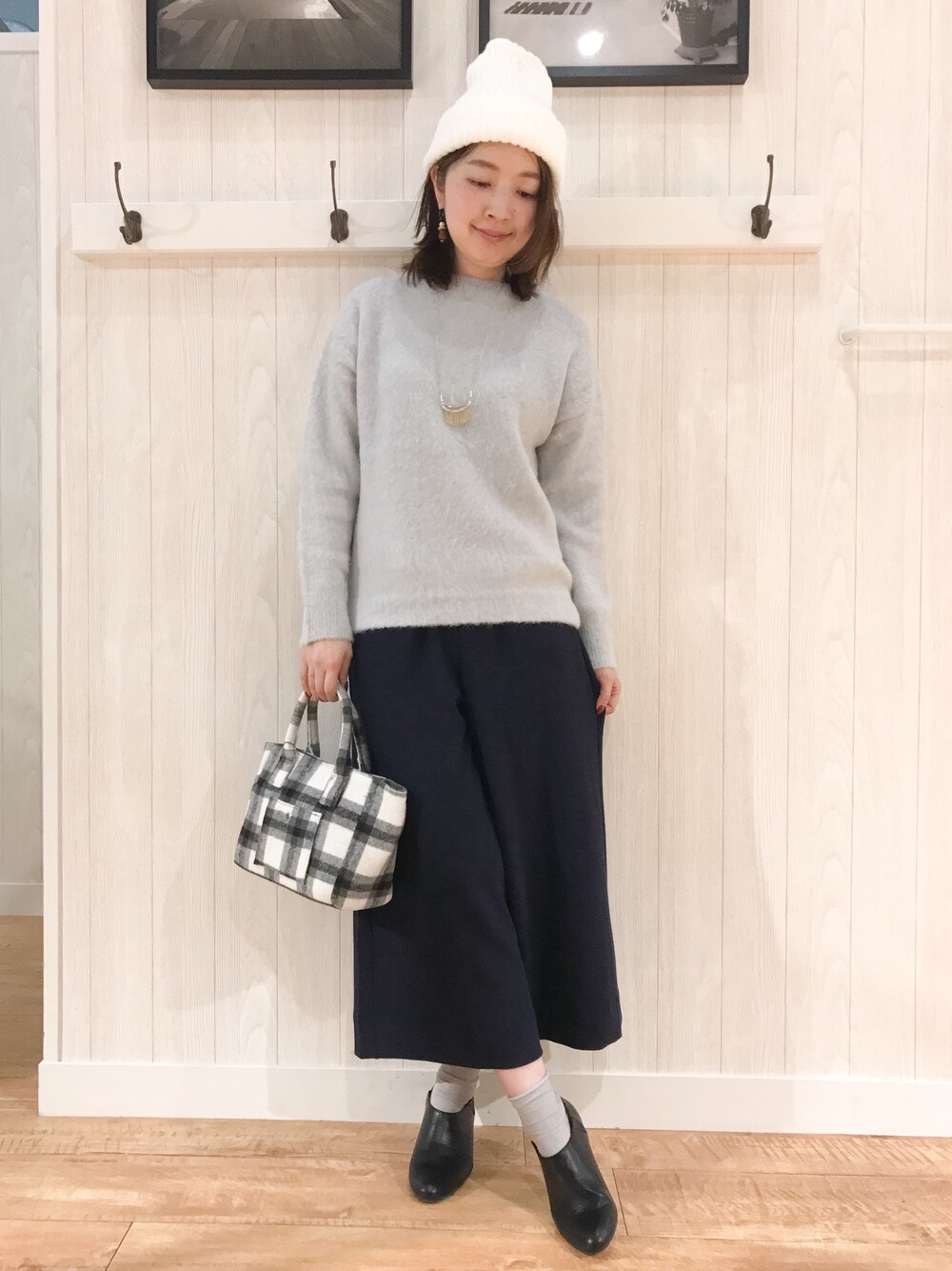 ご覧いただきありがとうございます(*^o^*) いつも いいねやSAVE、フォローまでありがとうございます♡ 昨日は寒かったですね💦😱 うっかり薄着で出かけてしまって、めっちゃ寒かったです(T ^ T) 田舎なので基本車移動なのですが、あまり外に出ないからって油断してました( ; ; ) でも、昨日UPしたもふもふクラッチを持って出かけてたので、膝に置いてたら暖かくて気持ちよかったです(*^_^*) さて、本日はDRESKIPのふわふわニットがメインのコーデです♪ 今週入った新商品なのですが、ウールとアルパカ混のふわふわっと優しい雰囲気のニットです^^ 首元もボトルネックで程よくつまっていて、暖かいです♪ そして何と言っても色展開が可愛くて😍 白・グレー・アイスブルー・キャメルの4色展開なのですが、柔らかいパステルカラーでどの色も可愛いです♡ 今回はアイスブルーをチョイスしました😊 透明感のある色みに一目ぼれです♡ 秋冬はアウターなどダークカラーが多いので、パステルカラーで明るい印象になっていいですね(*´∀`)♪ 検索しても出てこなかったので、きっと近日UPされるはず😌 合わせたスカンツは、裏起毛で暖かいタイプ♪ ストレッチもきいてるので、のびが良く履きやすいです(^◇^) 靴下合わせでカジュアルダウンさせました(^^) コーデが無地なので、バッグでチェック柄を取り入れてアクセントにしてます(*^o^*) 私事ですが、昨日ショックだったこと。 購入して間もないiPhone、落として画面少しヒビ割れしました(T ^ T) 変えたばかりなのにー( ; ; )
