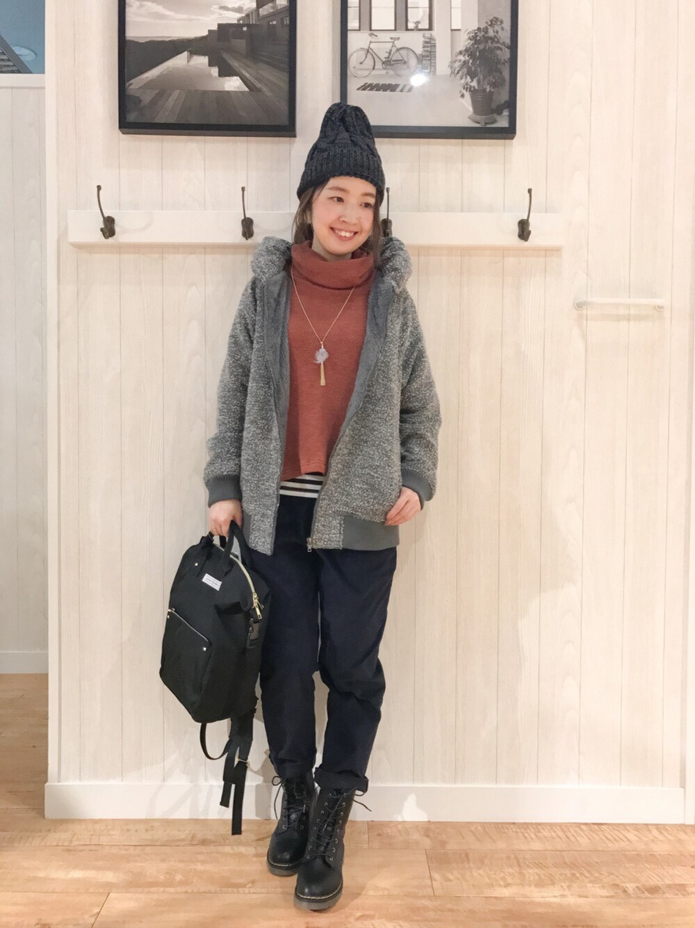 ご覧いただきありがとうございます(*^o^*) いつも いいねやSAVE、フォローもありがとうございます♡ 本日はカジュアルなブルゾンがメインのコーデです♪ こちらのCutie Blondeのブルゾンは、裏地がファーになっていて暖かいので冬のお出かけに重宝しそうです(^ ^) 合わせたニットは、ボーダーのカットソーと2枚セットのセットアイテム☆ 前が少し短めの丈で、ボーダーをチラ見せできるのが可愛くて気に入ってます♡ カラーはライトグレー×テラコッタの明るい組み合わせに、パンツのネイビーで引き締めてます(*^_^*) 小物はニット帽にリュックと鉄板カジュアル合わせ♪( ´∀`) 女子っぽい感じやキレイめも好きでよく着ますが、カジュアルも最近好きです(*^_^*)
