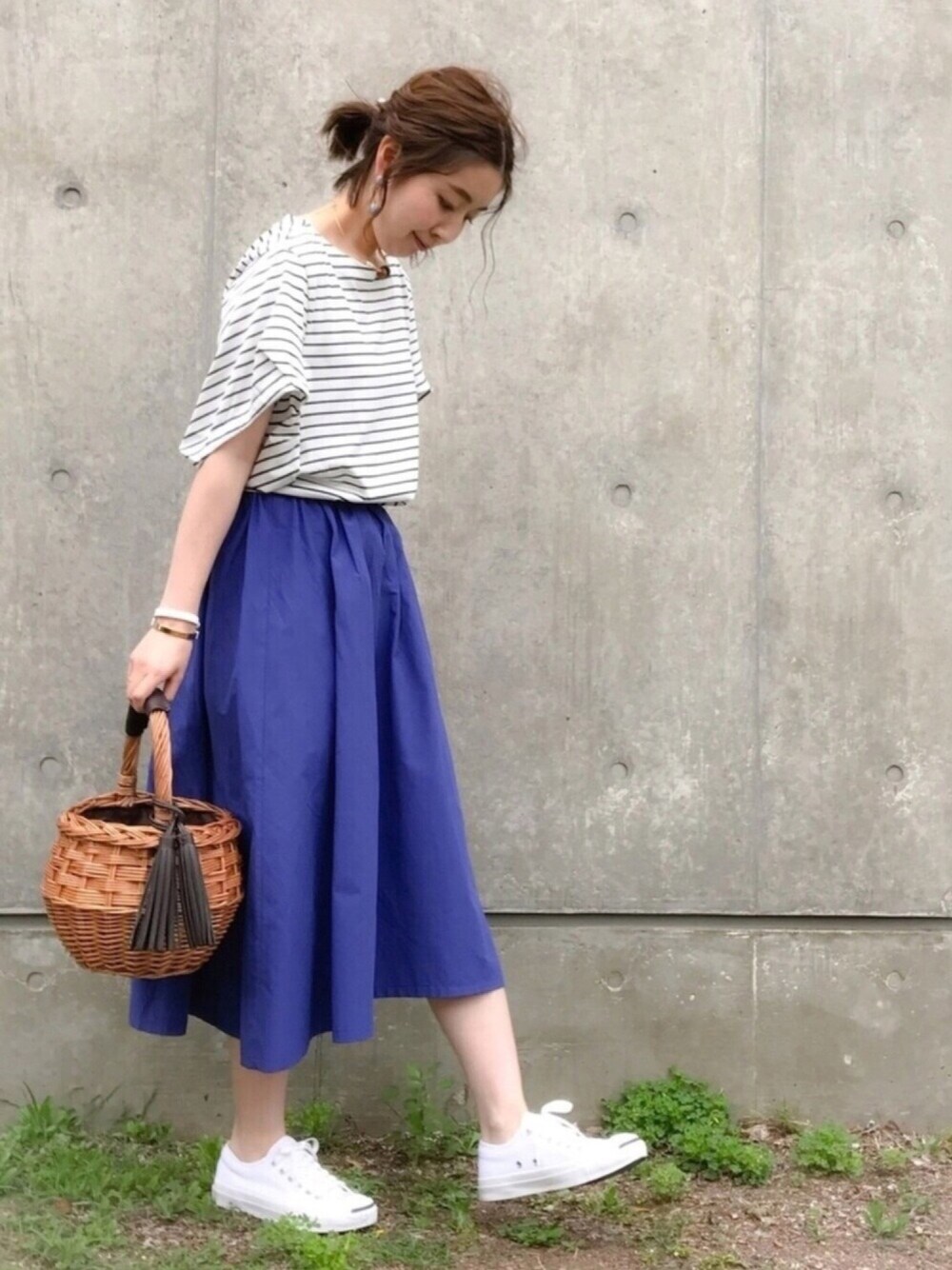 ご覧いただきありがとうございます(*^o^*) いつも いいねやお気に入り+、フォローもありがとうございます♡ 本日は、ボーダー×ブルー♪ 休日スタイルです(^^) DRESKIPのブルーのお色が綺麗なスカートを購入したので、早速着てみました♡ ハリのある素材で程よく広がるのが気に入ってます☺️ 丈は、前後差のあるタイプで後ろが長めです♪ トップスは、お袖にボリュームのあるボーダーカットソー♡ コットン混でさらっと着やすいです^^ カゴバッグに白スニーカー合わせで、リラックス感のある楽〜な感じにしました✨ 見てくださってありがとうございます♡ インスタ始めました(^ ^) ぜひこちらも遊びに来て下さい♡ Instagram▷rina_y26