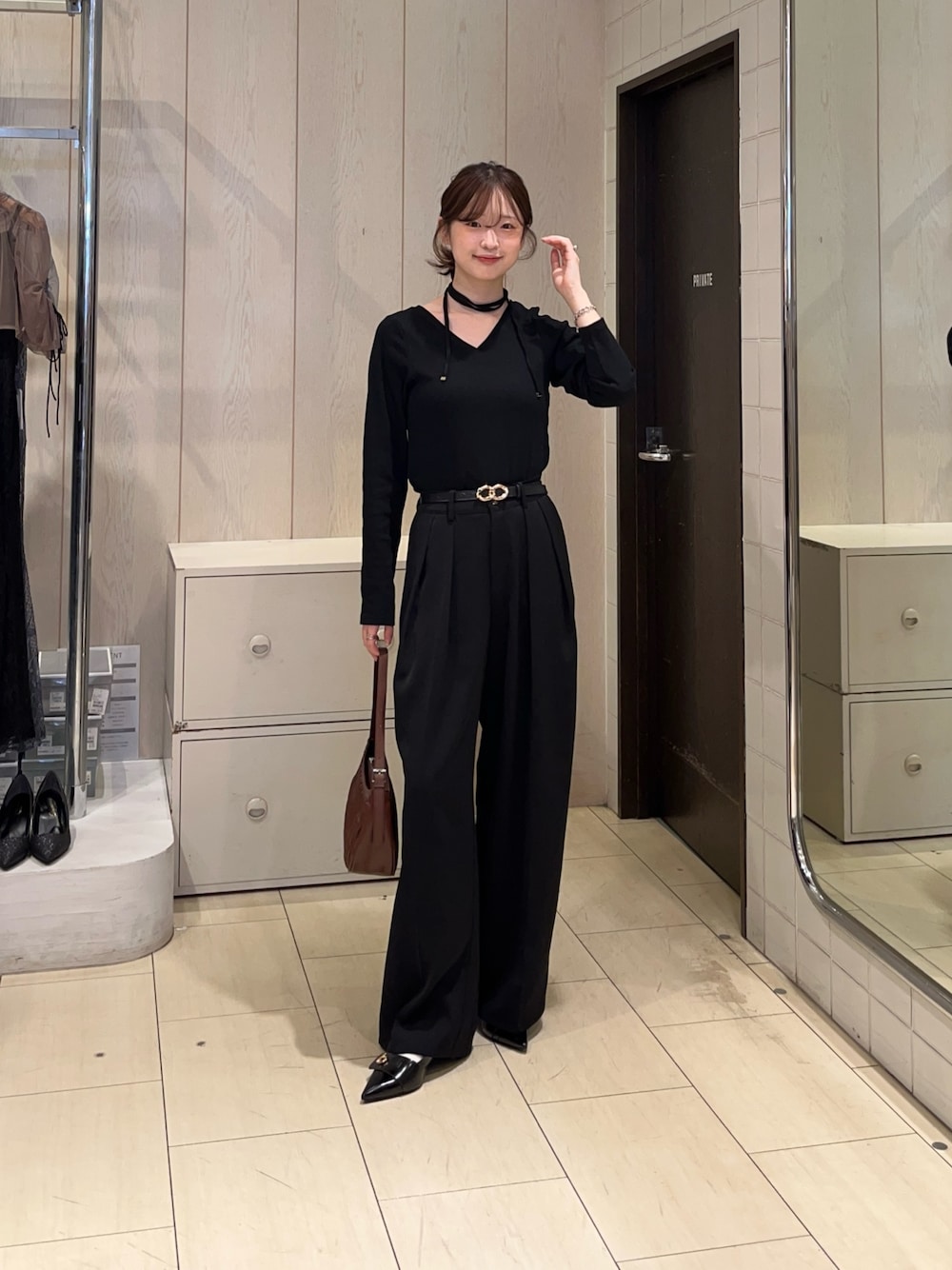 スラックスは高身長向けの丈長めサイズを履いてます! チョーカー付きの新作リブトップス♡ 甘くなりすぎないように、ブラックでまとめました! bagは秋っぽくブラウンに🍂
