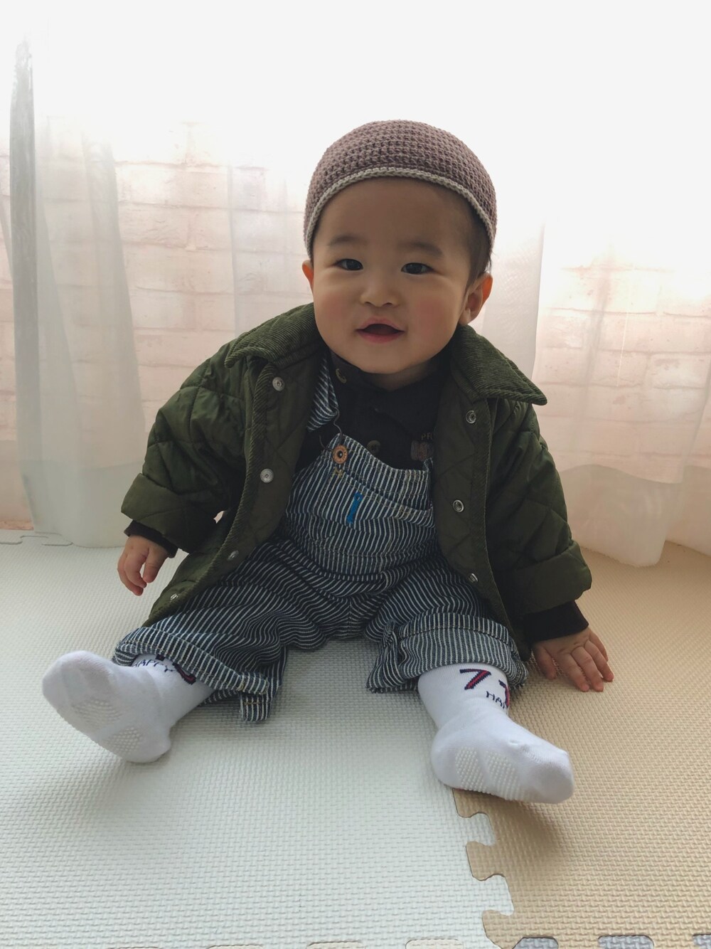 息子コーデ 1人でおっちゃんこが だいぶ安定してきました(つ∀`*) あ、おっちゃんこは北海道弁か!笑 おすわりって意味です👶