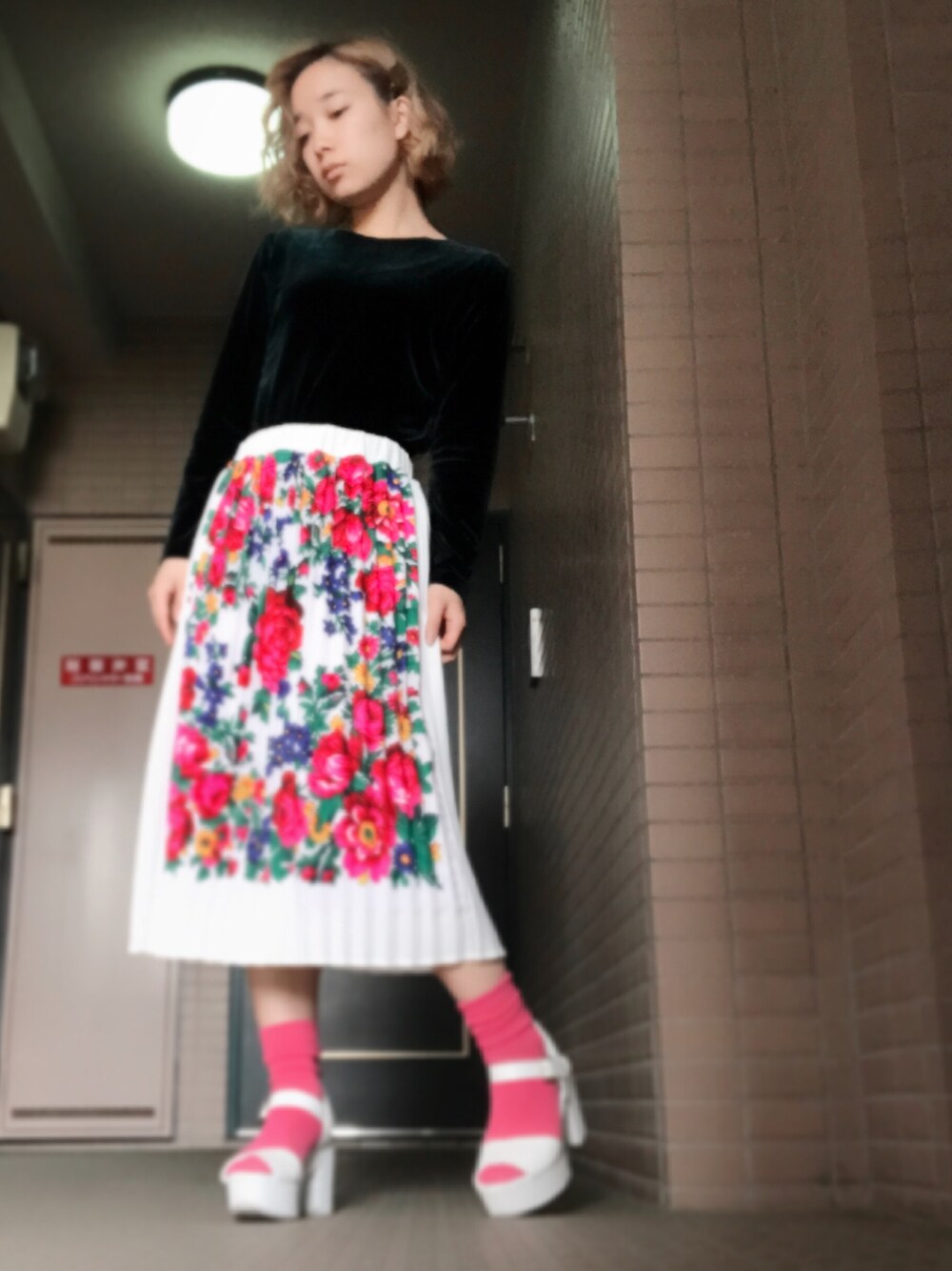 どんよりお天気だけど 派手な花柄着て気分あげよう🌼🌸🍀 靴下×サンダルができる季節になって嬉しい🌷🐝…