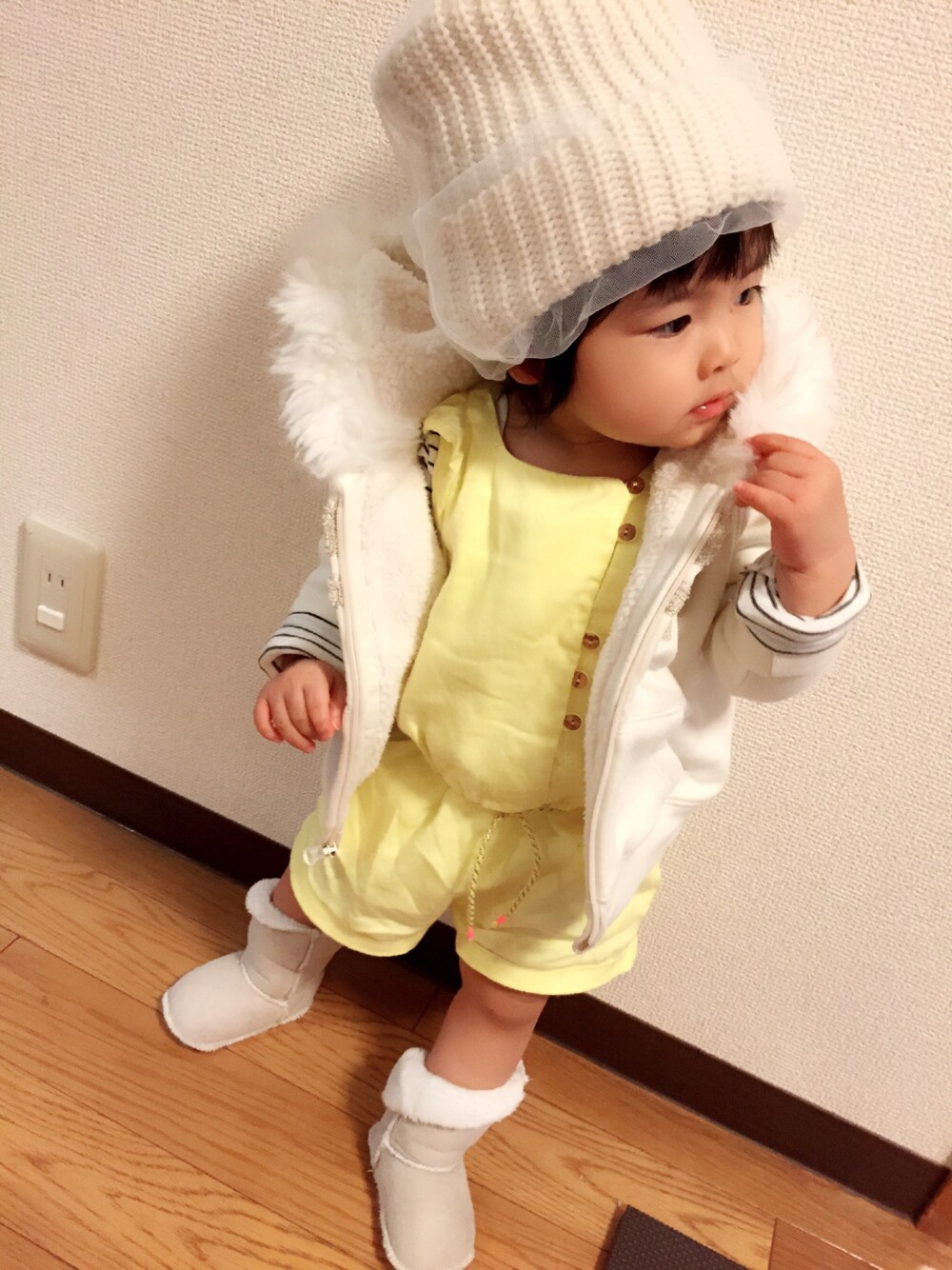 もうすぐ冬だけど、黄色コーデ🐥 つなぎって本当にオムツ替えが大変💦 実用性はゼロだな…😅