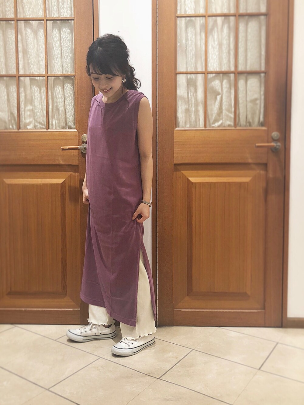 微笑んでいる☺️ やっぱりピンクを着れるのは女の子として嬉しいですね💞🙏🏻 落ち着いたピンクなので着やすいお色です!リブパンツも着心地が良すぎて、、💘 145の私でも着れちゃうワンピースです👶🏼