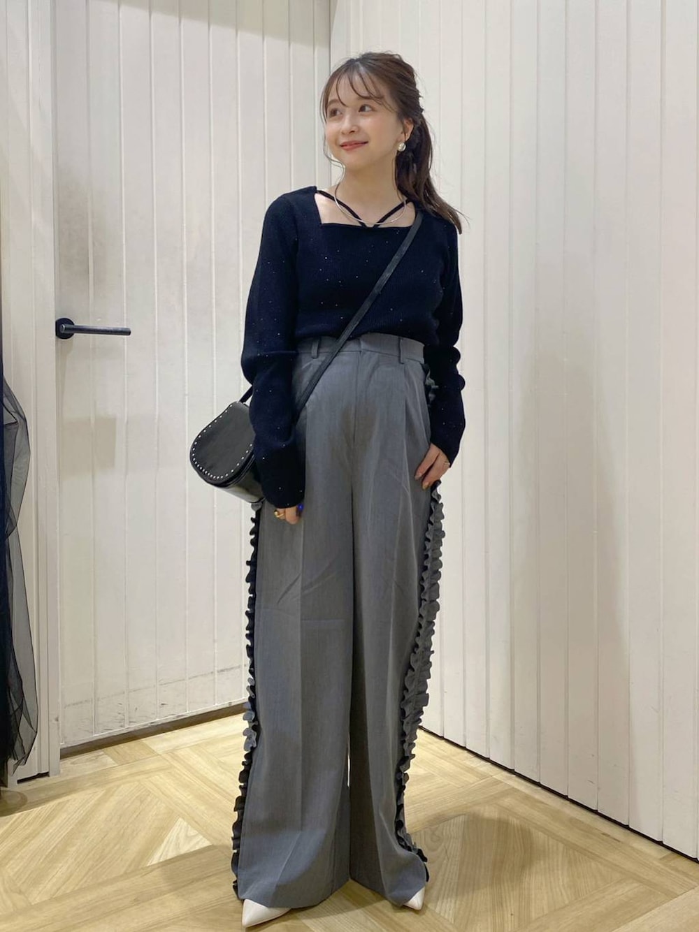 👕おすすめポイント  ̄ ̄ ̄ ̄ ̄ ̄ ̄ ̄ ̄ ̄ ̄ ̄ ̄ ̄ ̄ ̄ ̄ フリルデザインがかわいいパンツ♡ ワイドなパンツにタイトなトップスで 大人っぽく合わせてみました! トップスは首周りのデザインが シンプルになりすぎず、映えるトップスです✨ 《 staff board & Instagram 毎日更新中!》 どちらもフォローお待ちしてます💛 コーディネートが参考になったらお気に入り♡や、 こちら↓からカートに入れてもらえると嬉しいです♡