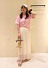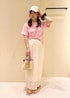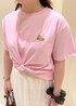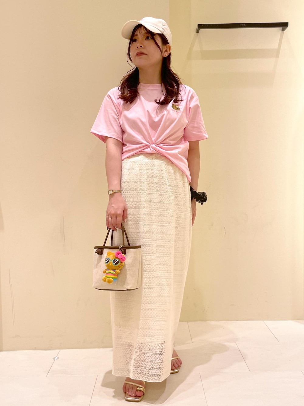 みんな大好きハローキティ/HELLO KITTYのアソートTシャツを使ったコーデ! ピンクTシャツで明るく可愛らしい印象に! ロント部分に小さな日焼けハローキティが付いてるのが可愛いコーデ! スカートと合わせて女性らしいキレイめカジュアルスタイルに! バッグにマスコットも付けてみました♡´-
