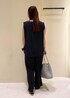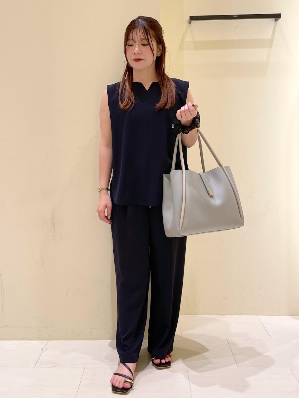 さらっと着られるノースリーブにパンツのセットアップを合わせた涼しく上品なコーデ! 小物はグレーで柔らかくまとめて、シンプルながらも大人な雰囲気に仕上げました♡´- お仕事にもお出かけにも使える万能スタイルです!
