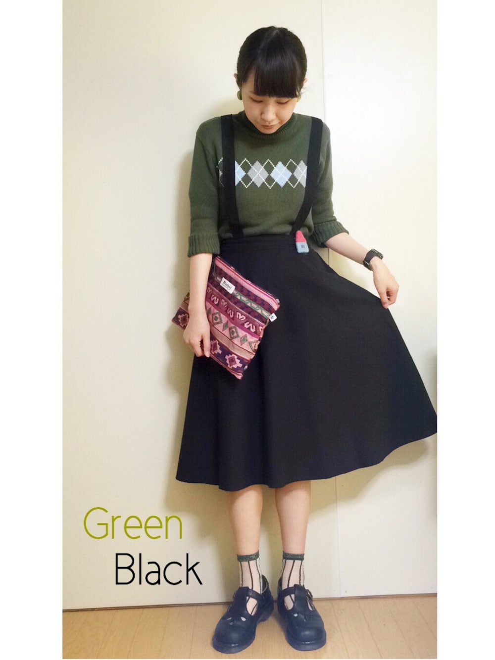 ▽Green×Black Green:トップス、イヤリング、時計(文字盤がミントグリーン)、ソックス Black:スカート、ブーツ、時計(ベルト部分) いんすたぐらむ→rina_0117