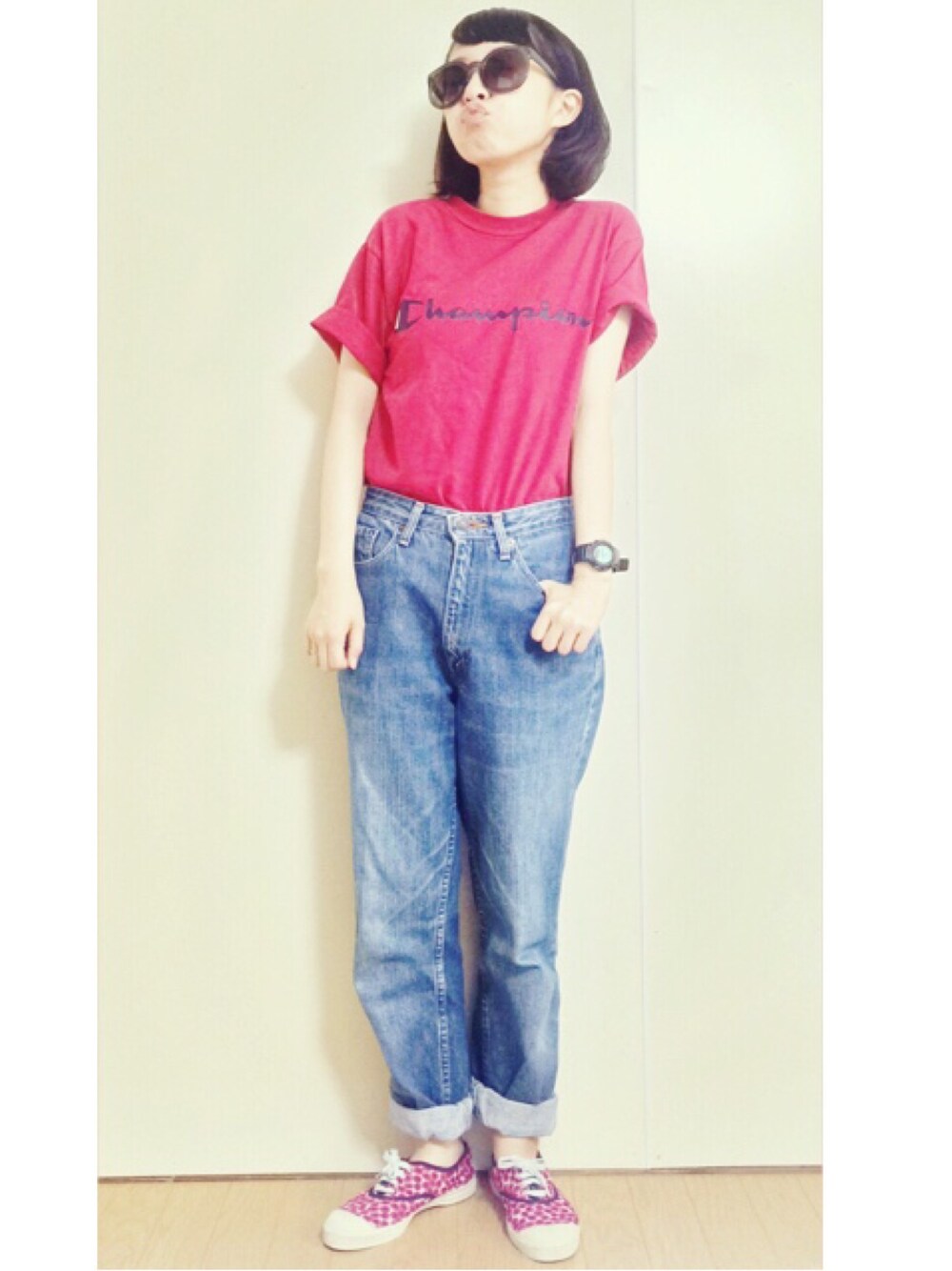 ▽赤 championのTシャツとスニーカーは 赤で揃えました(^O^) デニムと合わせてカジュアルに。 いんすたぐらむ→rina_0117