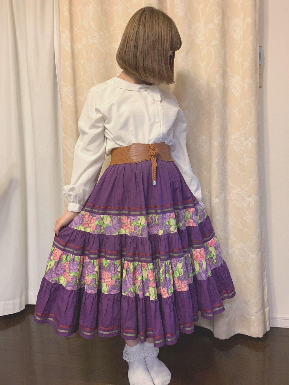 全身古着コーデです🥳🥳(靴下除く) 紫色のスカートを強調したいので、ブラウスは白にしました