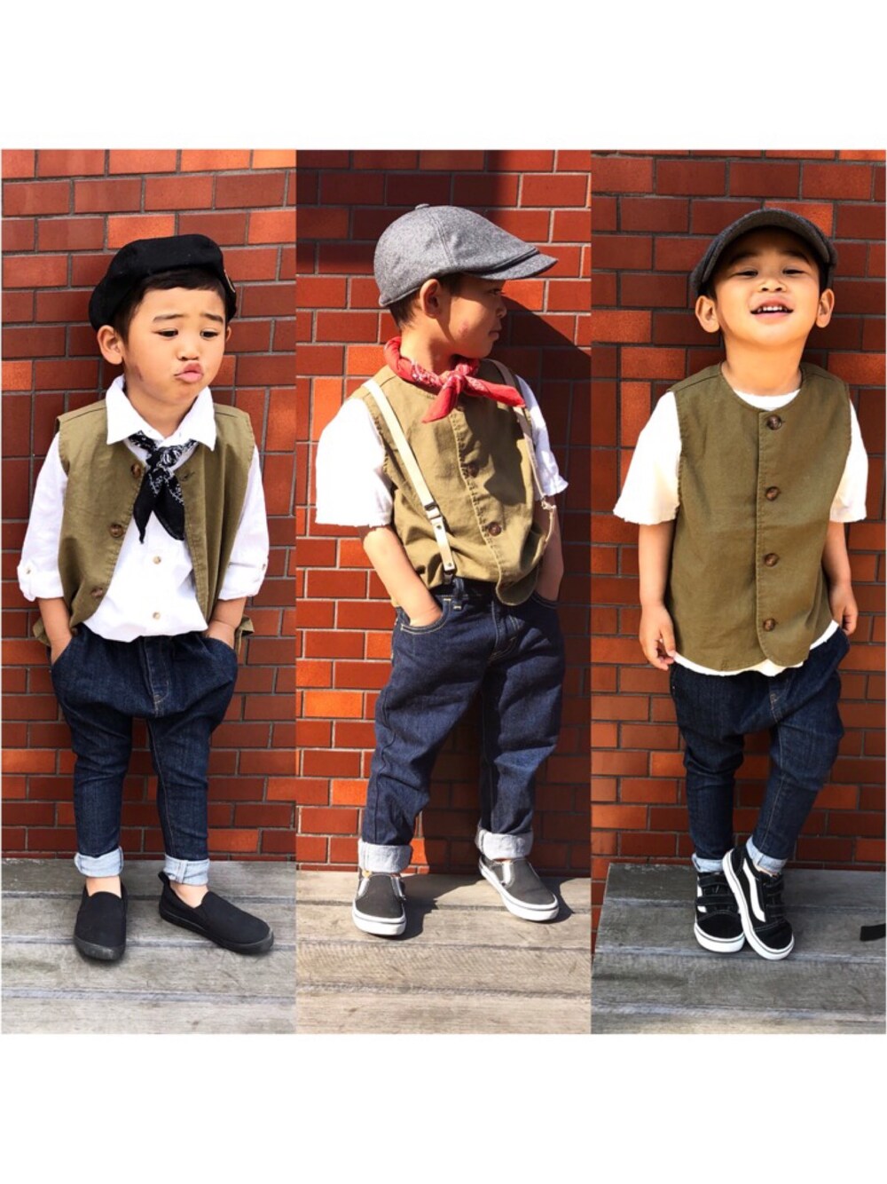 このkhakiベストの 着まわしパターン載せます♡ 着方変えるとこんなに 違う服に見えるのにビックリ👀 . むすこーで➡︎@eito_man