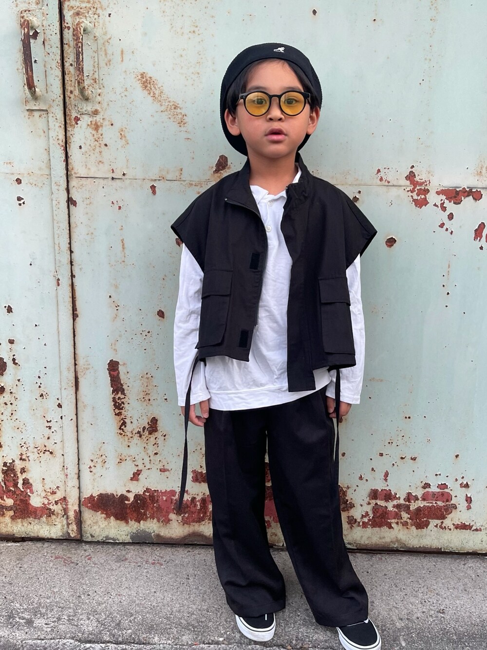 ブラック系のハンチング/ベレー帽を着用したキッズの春コーディネートの1枚目の写真