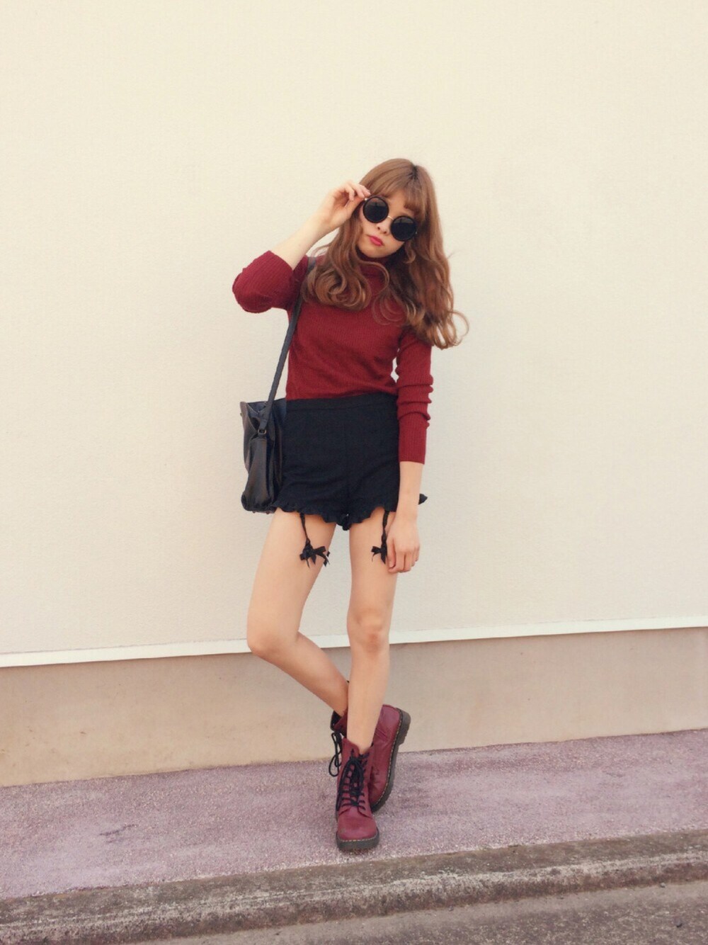 今年初の秋コーデしてみました♪♪ 秋カラー定番のボルドーを中心に黒と2色でシンプルに組みました! 夜でも寒くないように、、、♡