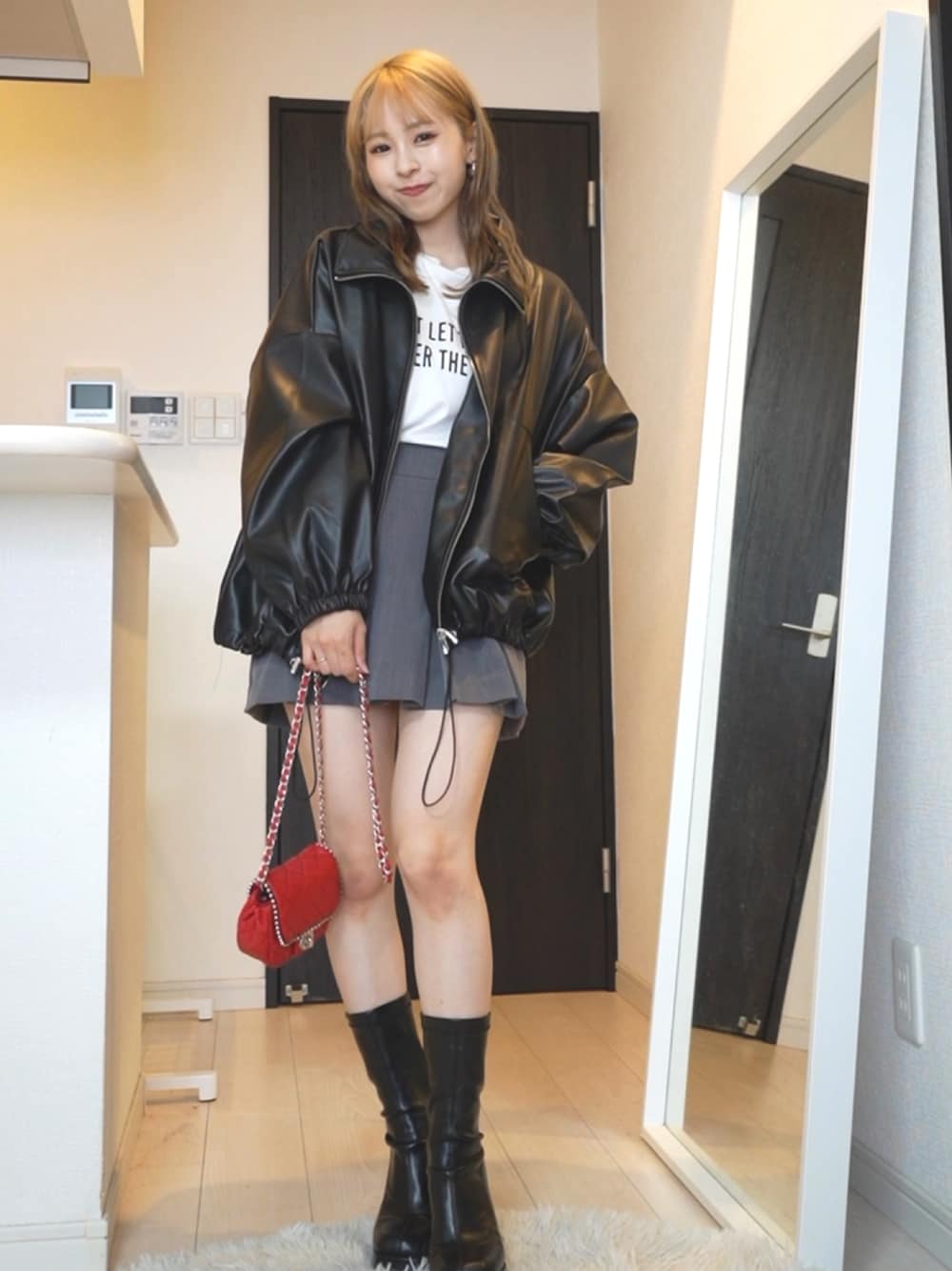 りなてぃのブルゾン「フェイクレザースタンドジップブルゾン」を使ったコーディネート