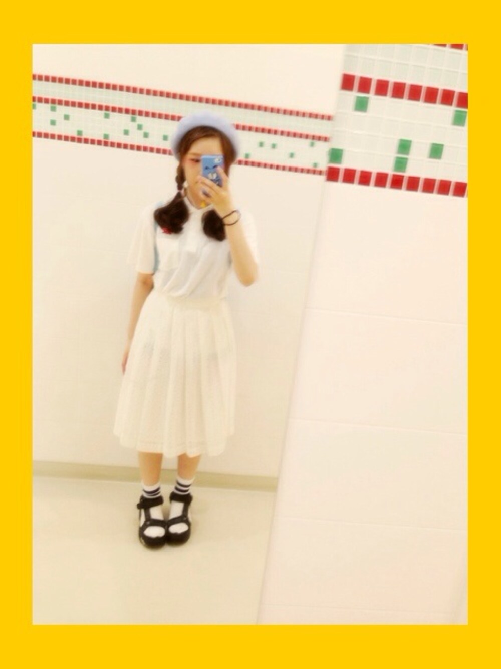 ホワイトスタイル😊💟 このスカートはお母さんが若いときに着てたお下がりです🌟🌟 こうやってまた履けてよかったな。って思います🌈🌈 見えないけどブルーのカンケンしょってます。