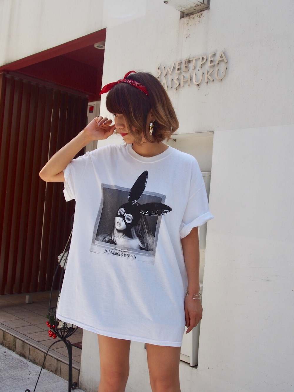 . いつもいいね、ありがとうございます😊 . 今日は、ARIANA GRANDE Tシャツ/XLサイズを着用しました . 日本でライブも行われますし、ぜひ着て行きたい1枚! おすすめは、大きめのサイズをワンピース風に着るのがかわいいです♡