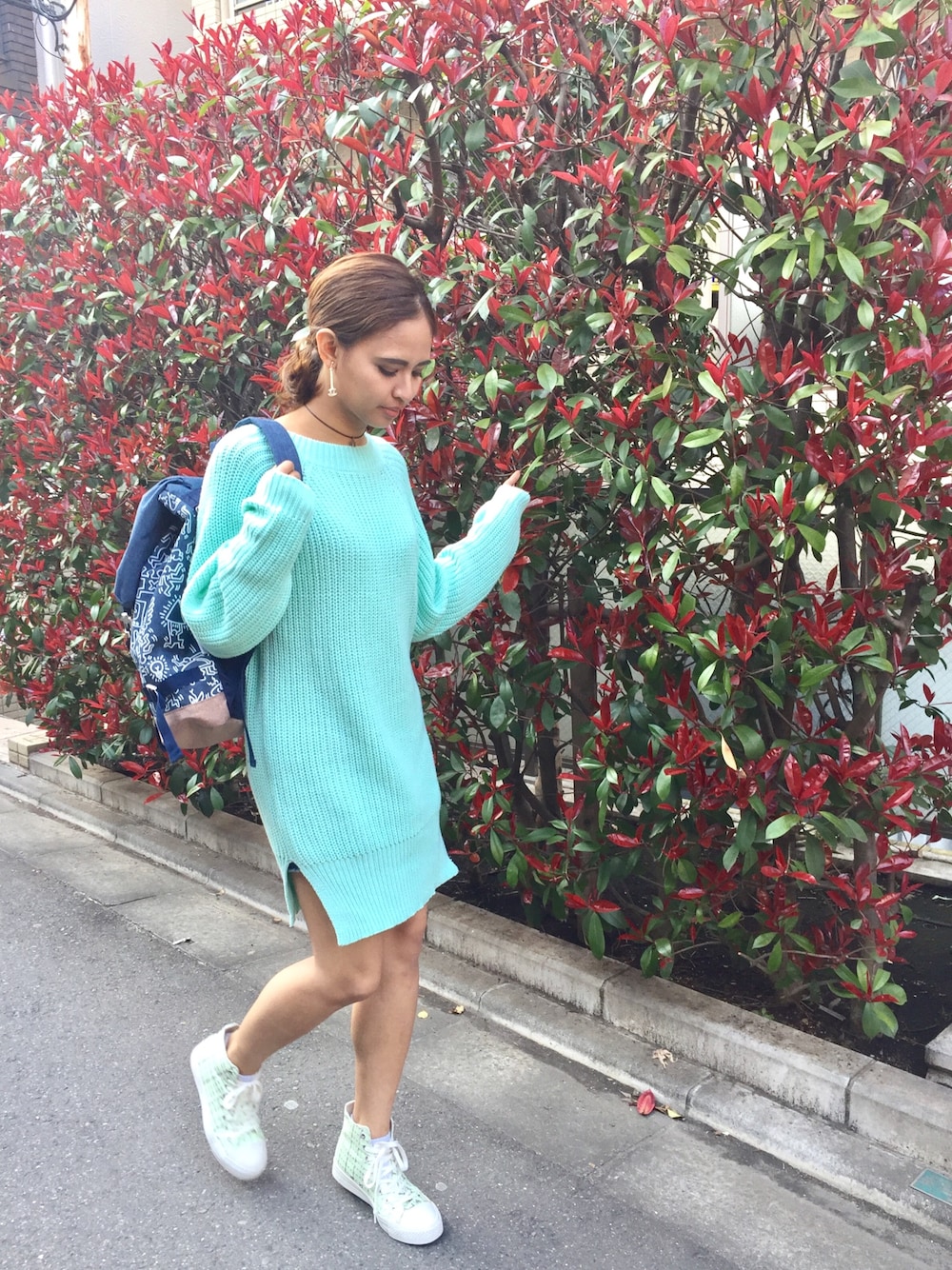 . シンプルニット/ライトグリーン/Mサイズ ぷらぷらCラインストーンイヤリング キースへリングフラップリュック/ブルー クローバーヘアゴム . 暖かくなった今日は、シンプルなカラーニットワンピにリュックを背負ってお出かけしたくなりますね♪ . シンプルなニットには、小物使いでおしゃれに! キースへリングのリュックやイヤリング、ヘアゴムを合わせました