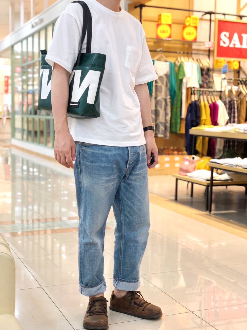 白Tシャツにデニムです。 モンタナは隙間があって、サンダルっぽい感覚で軽く履けて良い感じです🙆♂️