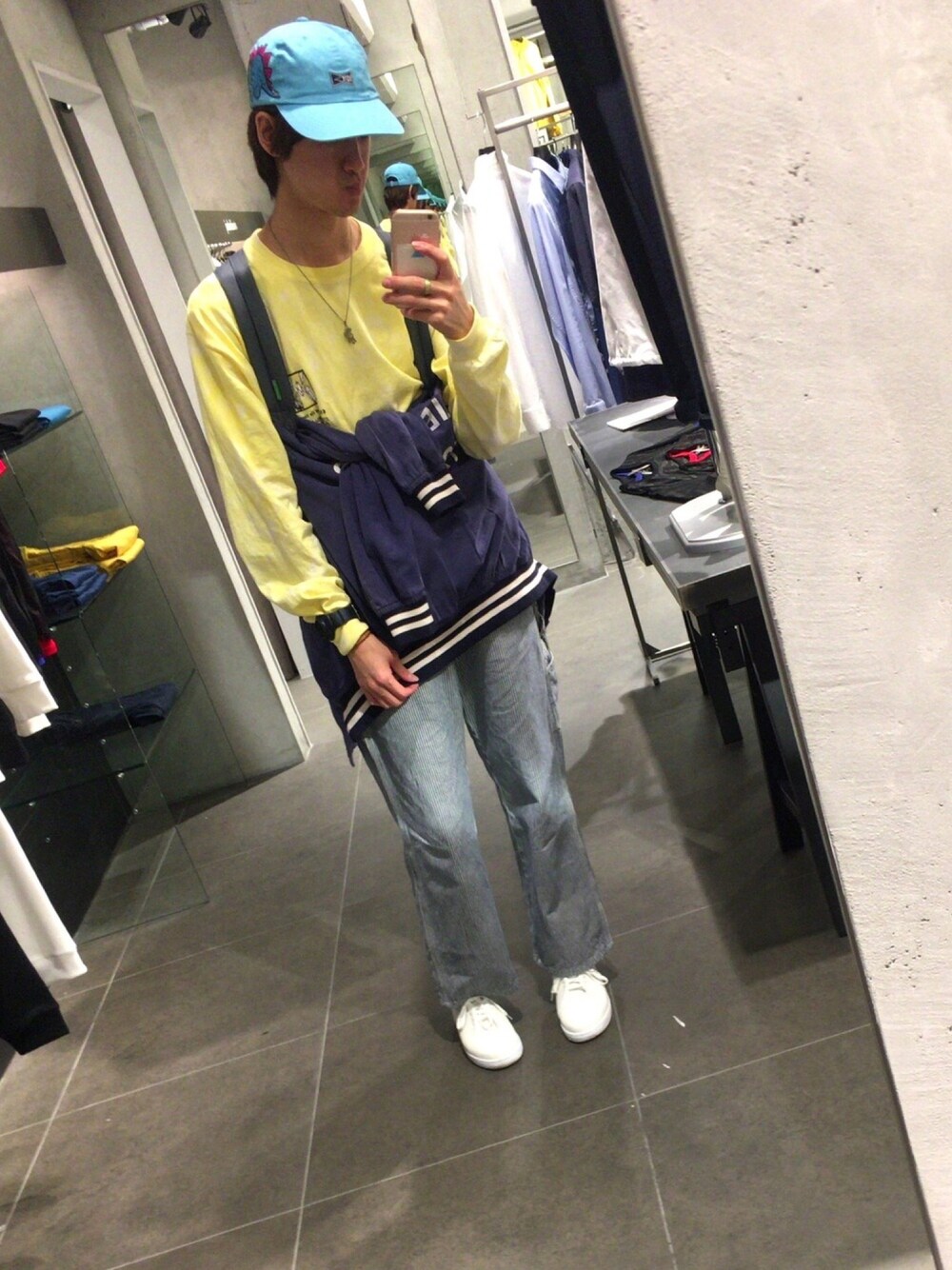 4月9日、ダサい。でも好きな感じです(^^) 脱いだ上着の行き場を発見しました。手に持たなくても良い。リュックのストラップに絡めるという方法を提唱します。ぜひやってみてください。 この日は少し改装した池袋パルコのショップを巡ってきました。 チルドレンの新作のジャケットを試着しました。かっこよかったなー。デニム生地では無かったけど、型はジージャンの初期のものをモデルにしてるみたいです。