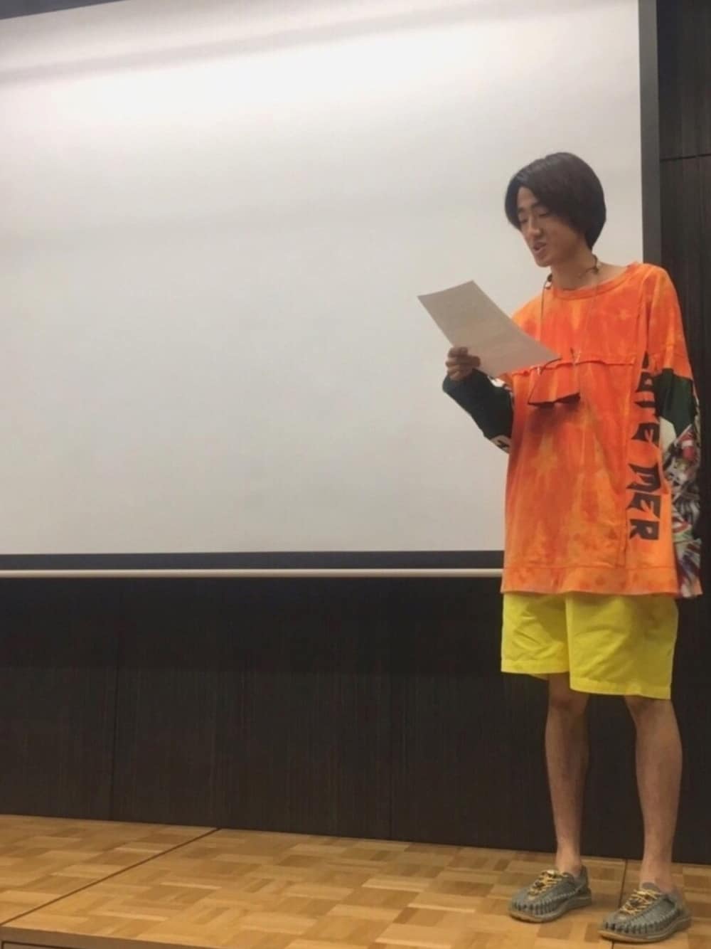 7月1日。 めぐるファッションラボ2日目の最後に感想を述べてたときの写真。 トークのお題の中に「あなたにとってのエシカルファッションとは?」という問いがありました。みんなそれぞれで面白かったなー、りんりんさんは、これからトレンドにしていくものと言いました。 ということで、ぼくの腕にかかってるってことですかね?笑 2日目は、1日目の講義を踏まえてグループワーク。グループごとのテーマにあわせてビジネスに落とし込んで最後にプレゼンという感じのプログラムでした。 みんなそれぞれにフィールドワークなどをして思考を巡らすやつ。 ぼくのグループは、実現可能性を無視した、未来的なぶっ飛んだプレゼンをしました。なかなかの印象をみんなに残せたんじゃないかなー😊 最後にはぼくのおもしろお洋服コレクションの紹介をさせてもらいました。みんな食いついてくれた。純粋に嬉しかったですね、 1日目のことは、4つ前の投稿で書いてるので是非読んでください💕 この日は気持ち派手めの服にしました。 リメイクブランドのコートメール。 オレンジのトップスにレモンイエローという組み合わせでしたー。 あ、貼った写真は、INHEELSのユカさんとありちゃんこと、鎌田安里紗さんとの3ショット。 あと、捨てられる端切れとかから作られたTシャツを持ったぼく。 そして、教材。