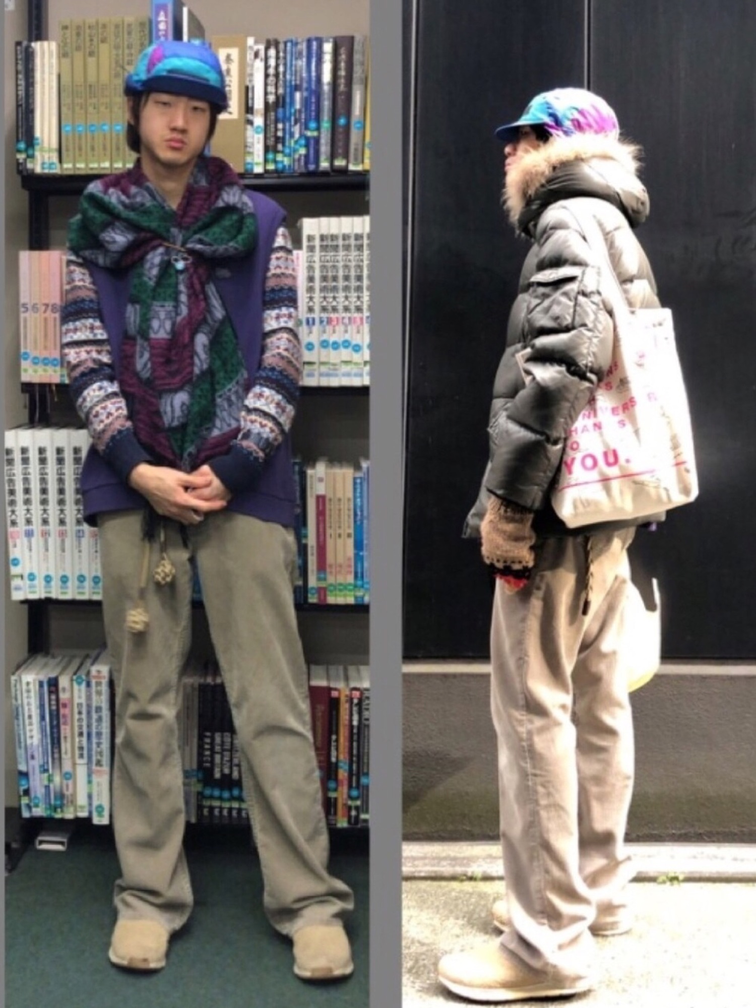 1月15日、図書館で本探しからのお仕事。 ニットカーディガン×スウェットベスト、下ベージュ。 冬素材フル装備。