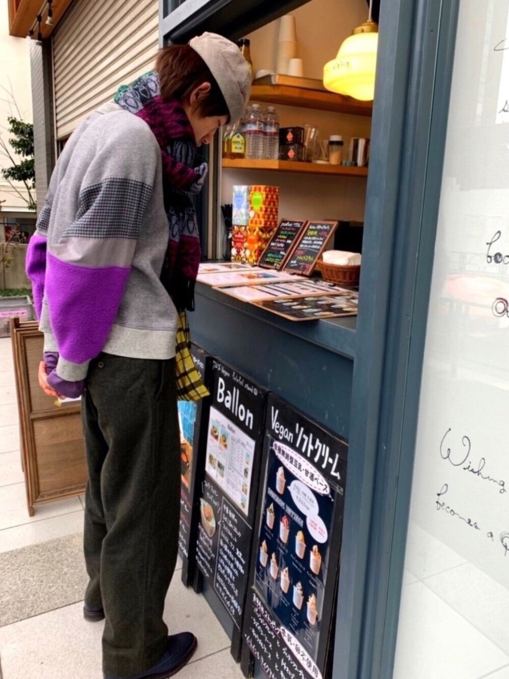 前回の投稿のアウターなしver.です。 中目黒のBallonというファラフェルサンドのお店で注文しているところ。 サステナブルなファストフードを掲げているお店です。 そして、載せているバラの写真は、広尾のアフリカローズというところのです。 アフリカローズはその名の通りアフリカでバラを栽培しているのですが、すごく珍しいバラたちがいます。そして、アフリカでの雇用を確保していて、これもサステナブル。