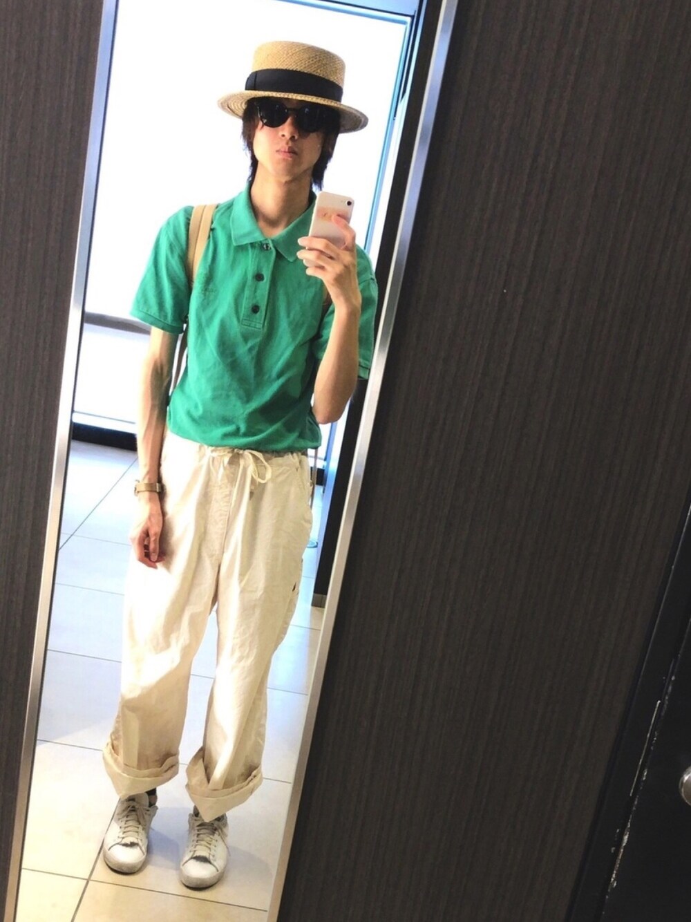 カンカン帽と襟ものを合わせたくて、 あと、このパンツでタックインしたくて、 そういう考えのもとで服選びしたちょいダサコーデです。 基本ベージュ、グリーン、ホワイト。 8月1日のでしたー