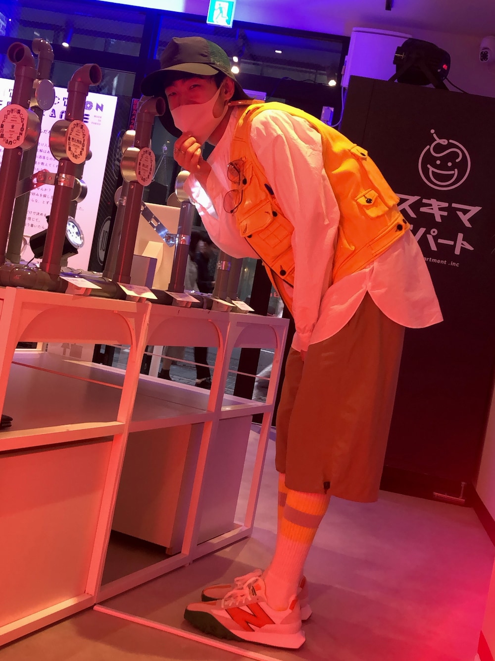 9月11日 スキマデパートと5W1Hとのコラボポップアップ「香りの無人研究室 渋谷」に行ってきました。 無人なのに、スキマデパートの方も5W1Hの方もたまたまいらっしゃいまして、おしゃべりしたり、記念撮影したりしました。 この日の格好は久々のハイソックス&ハーフパンツ。ドレス系シャツをワーク、アウトドアな雰囲気に。 カサブランカとニューバランスのスニーカーもおろしました。