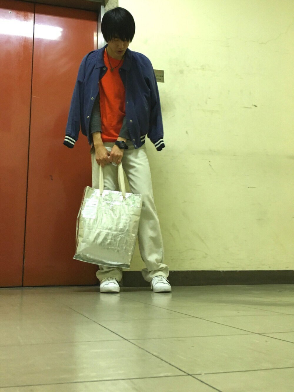 beautiful peapleのショップバッグを普段使いしてます。バイト先のロッカールーム前の通路でパシャった15日。