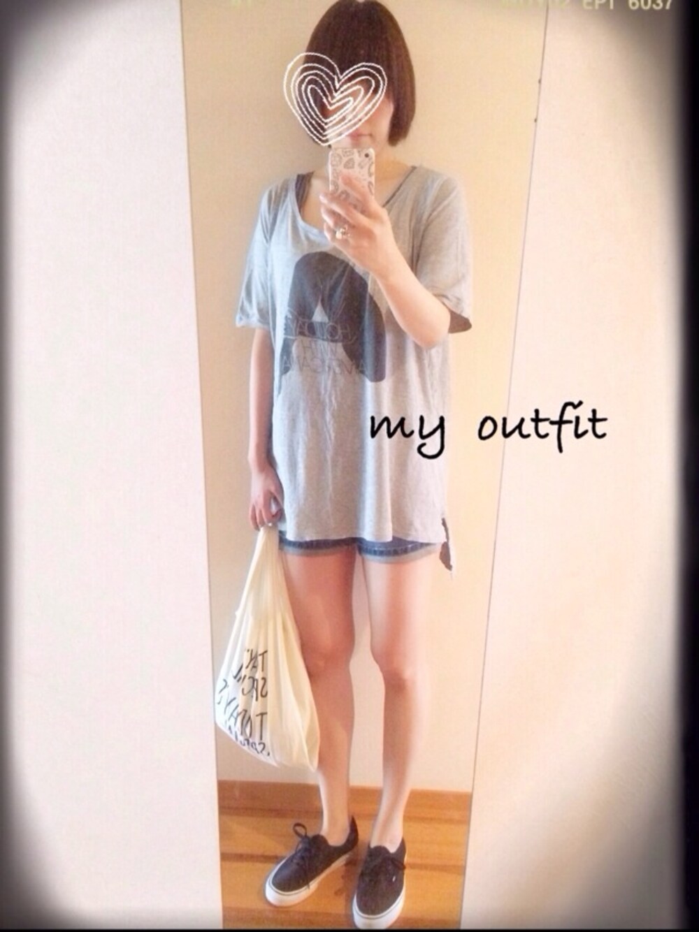 グレー系のTシャツ/カットソー、ブラック系のスニーカーを着用したレディースの夏コーディネートの1枚目の写真